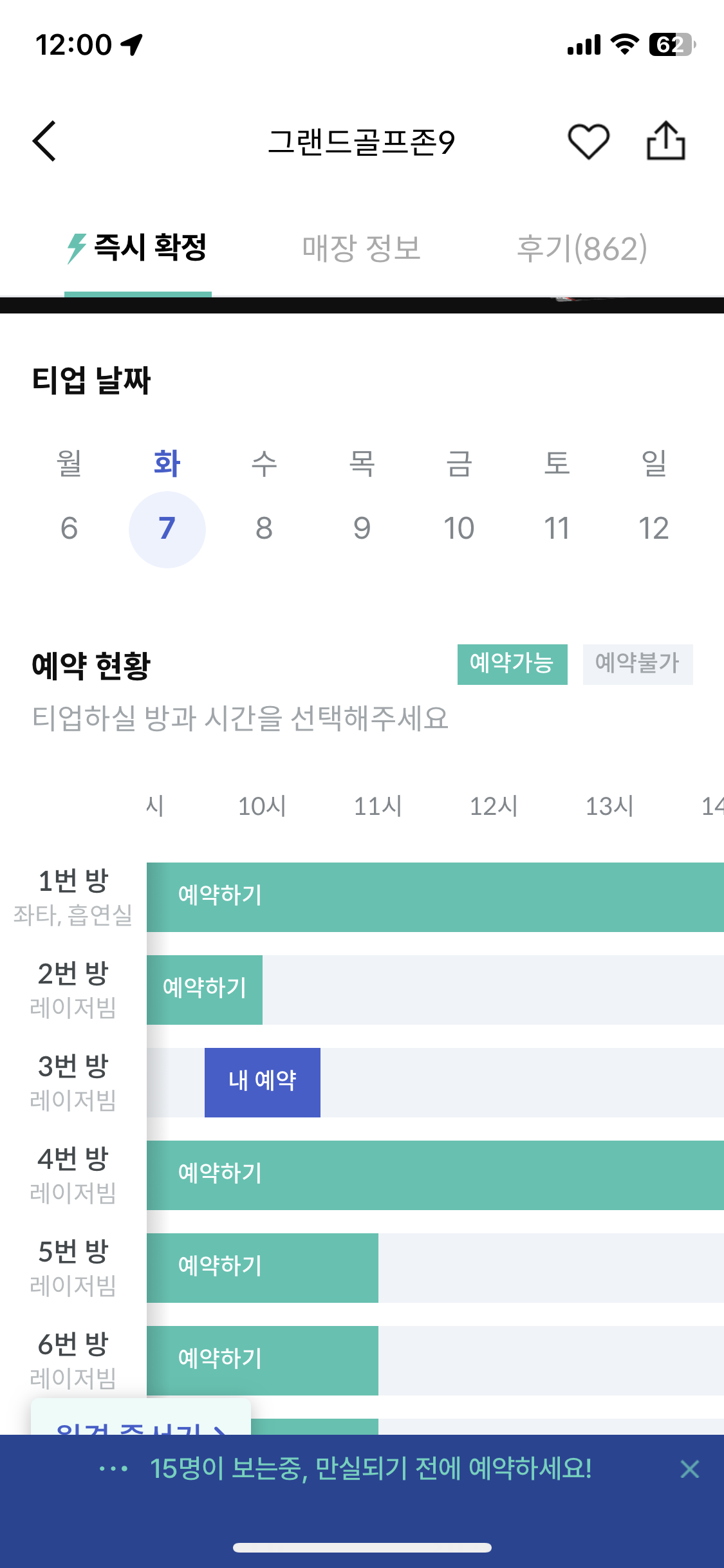 | 지도에 매장 이름과 금액 정보까지 뜹니다. 원하시는 지역으로 이동해서 선택하시면 됩니다. 그 다음으로는 날짜와 원하는 방, 그리고 시간을 선택하면 됩니다. 먼저 날짜를 선택하시고 원하는 시간대가 있는 방의 초록색 부분을 클릭하면 세번째 그림처럼 세부 내용을 선택할 수 있습니다. 라운딩 인원, 게임 수, 그리고 시간대를 선택할 수 있어요. 그리고 예약하기 버튼을 누르면 예약이 완료됩니다. 정말 편리하죠. 주의 하실 사항은 모든 매장이 위 그림처럼 모든 방 예약 상황을 보여주진 않습니다. 그렇지 않은 매장이 있구요. 어떤 매장은 전화로만 예약이 가능한 매장도 있었습니다. 그런 매장은 왜 김캐디에 올라와 있는지 모르겠습니다. | ||