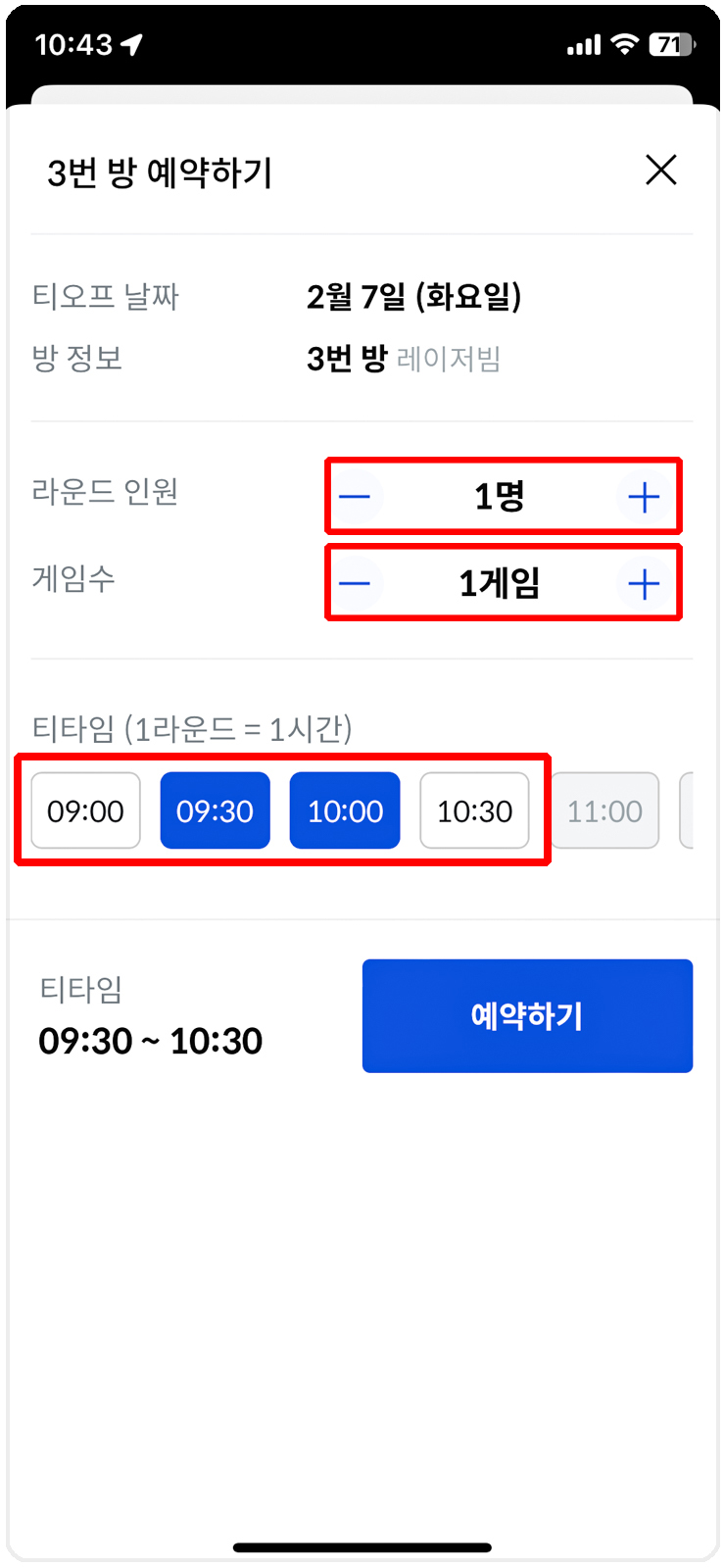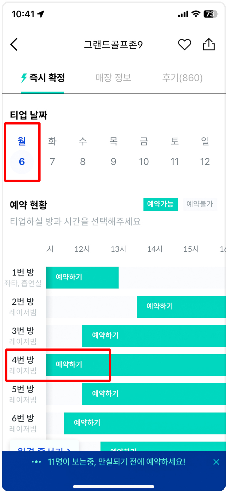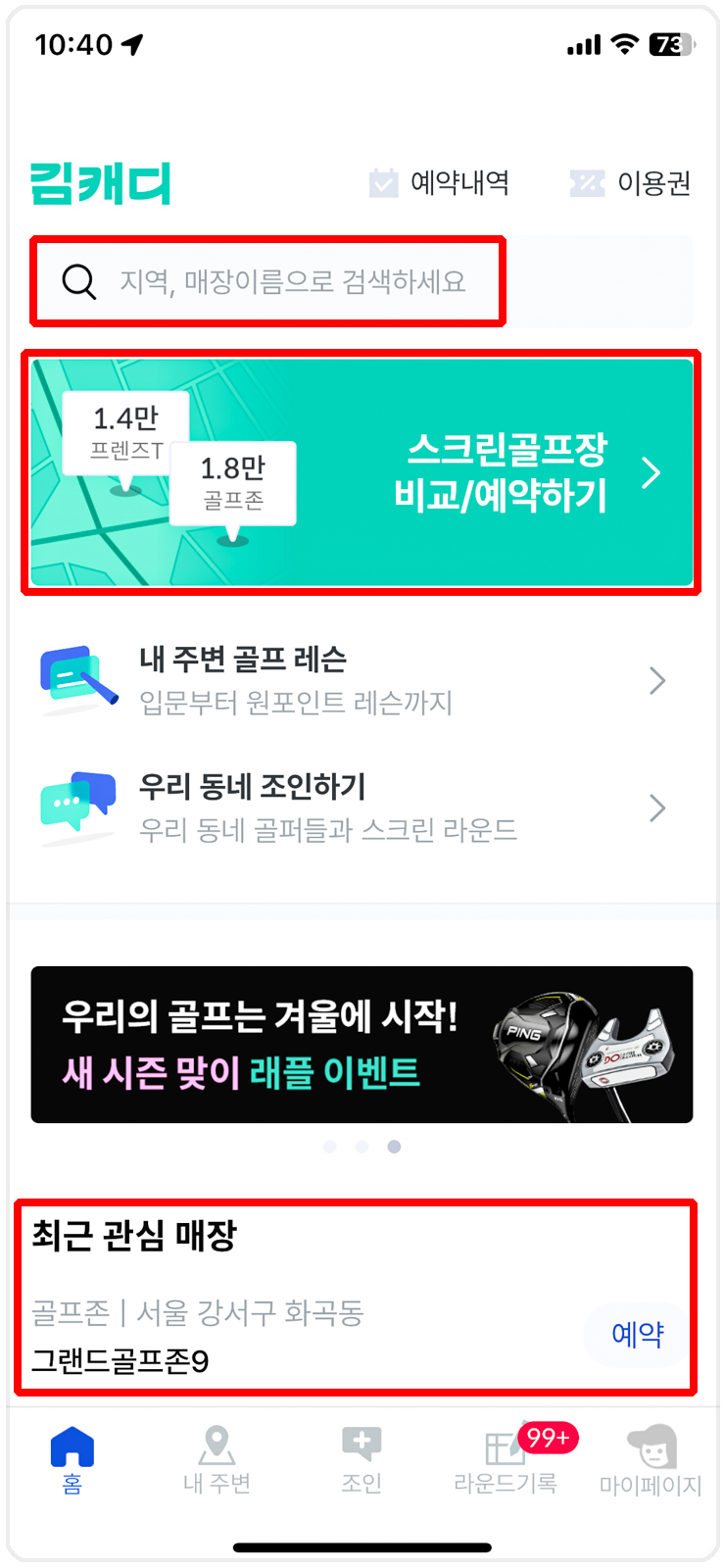 골프존 앱에서도 예약은 가능합니다. 전에는 없었던 기능인데 언제부터인지 모르겠지만 어느 날 보니 예약하기가 있더라구요. 그런데 김캐디처럼 예약 현황을 보면서 예약을 할 수 없어 저는 사용을 하지 않습니다.
