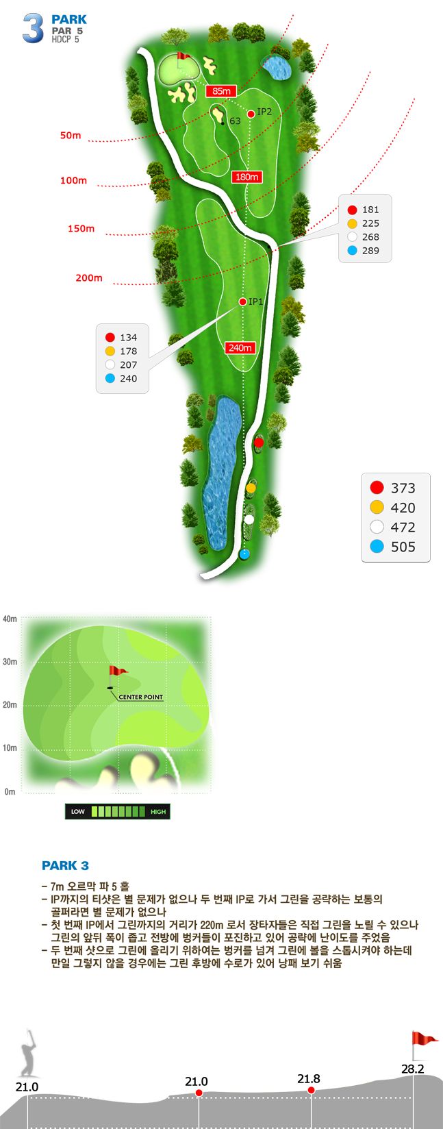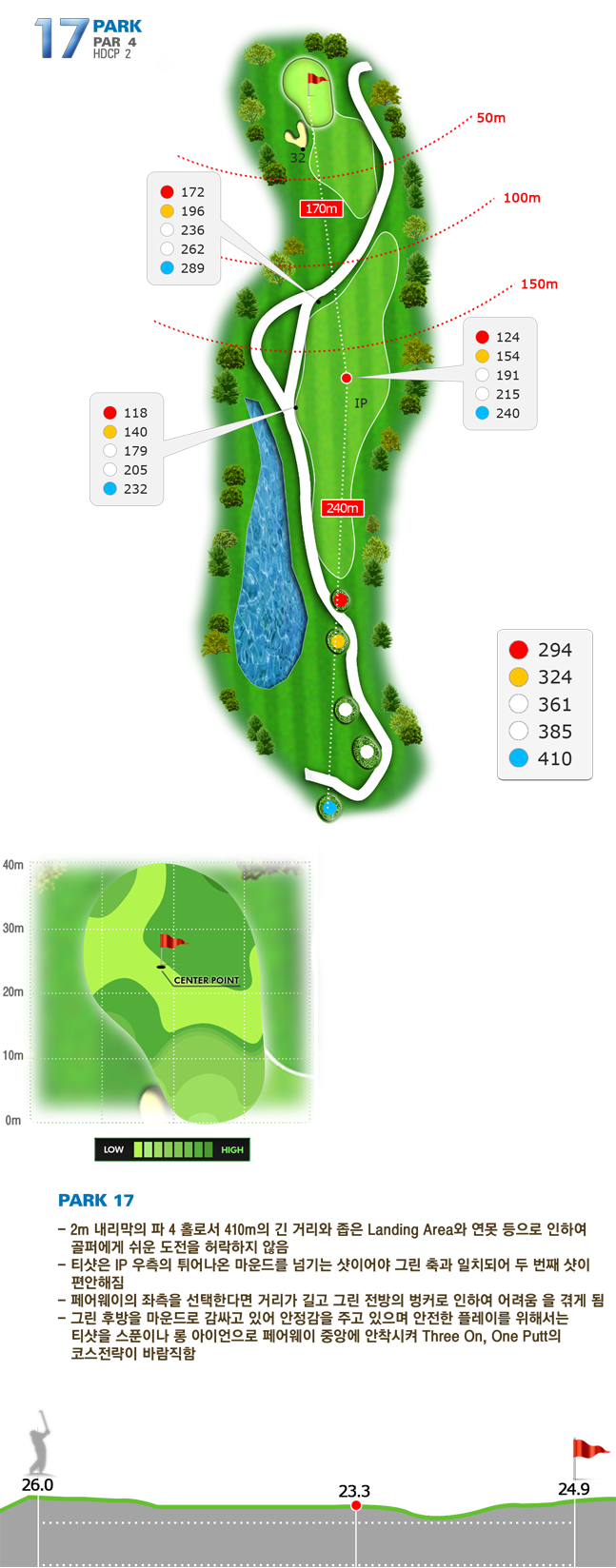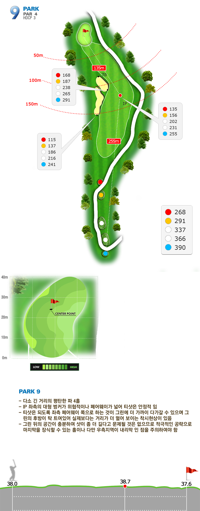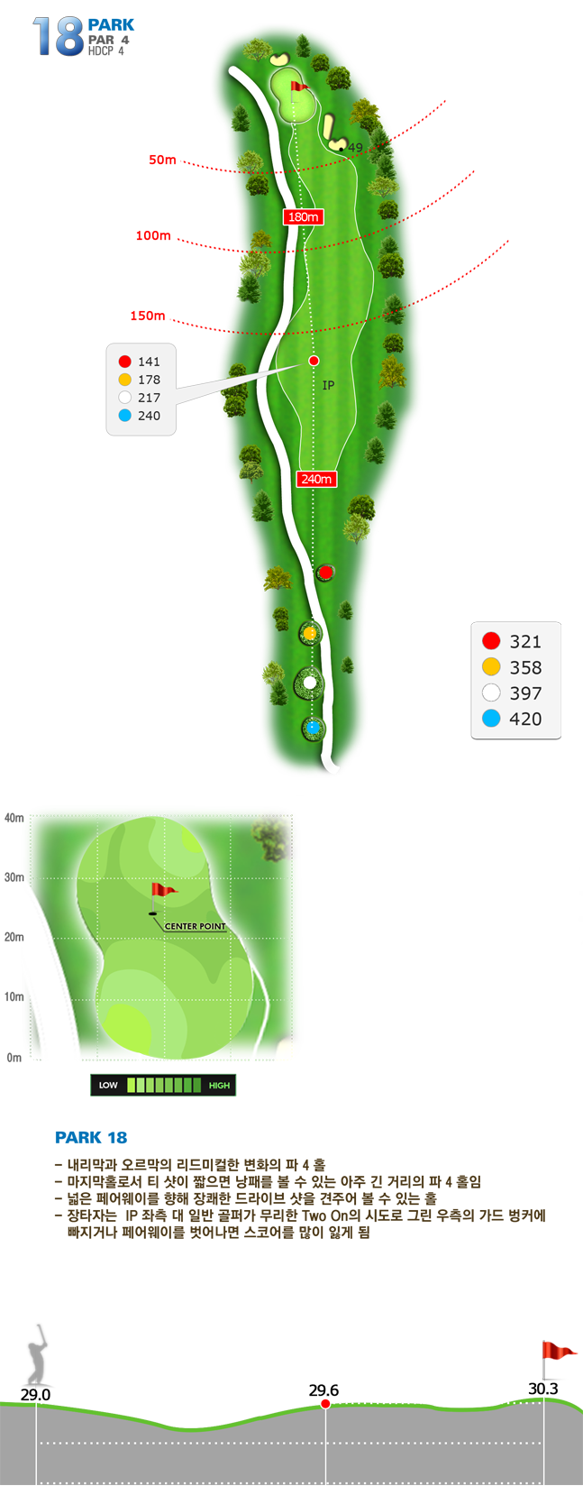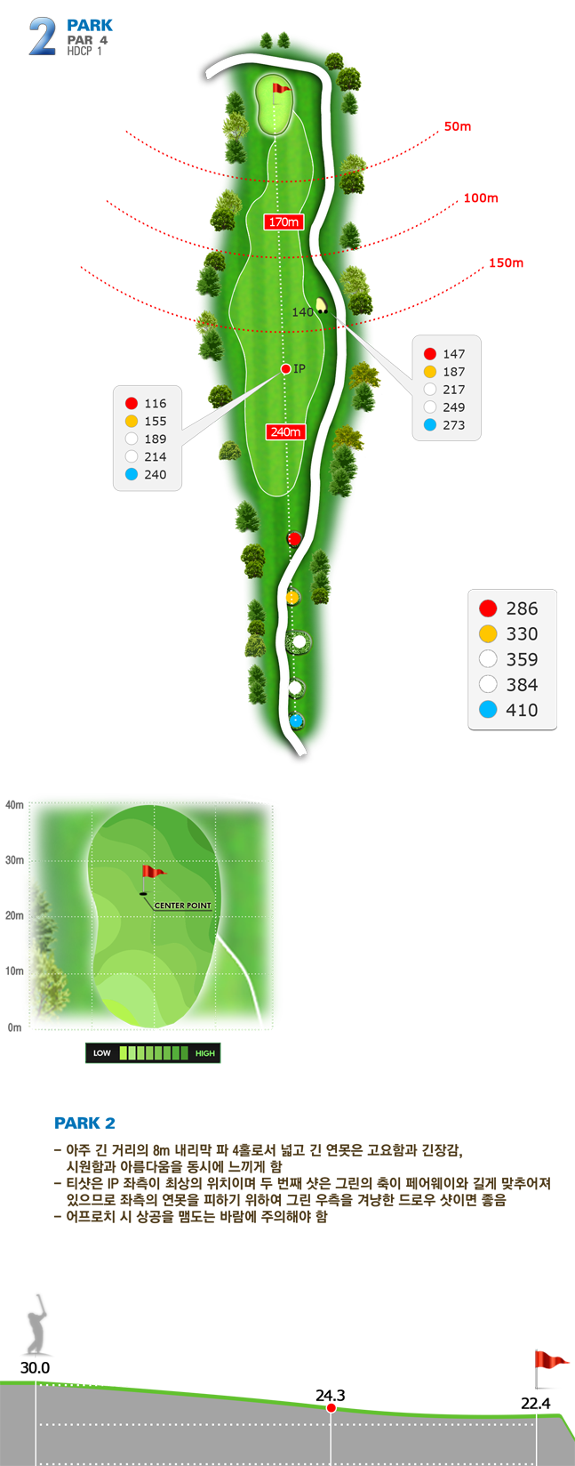 | 파크 OUT 코스 02번 파4홀. 전장 약 380m로 길다. 티샷은 왼쪽 러프. 180m 유틸리티 21도로 그린 우측 안착. 투 펏으로 파!! | |