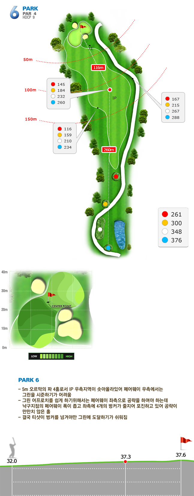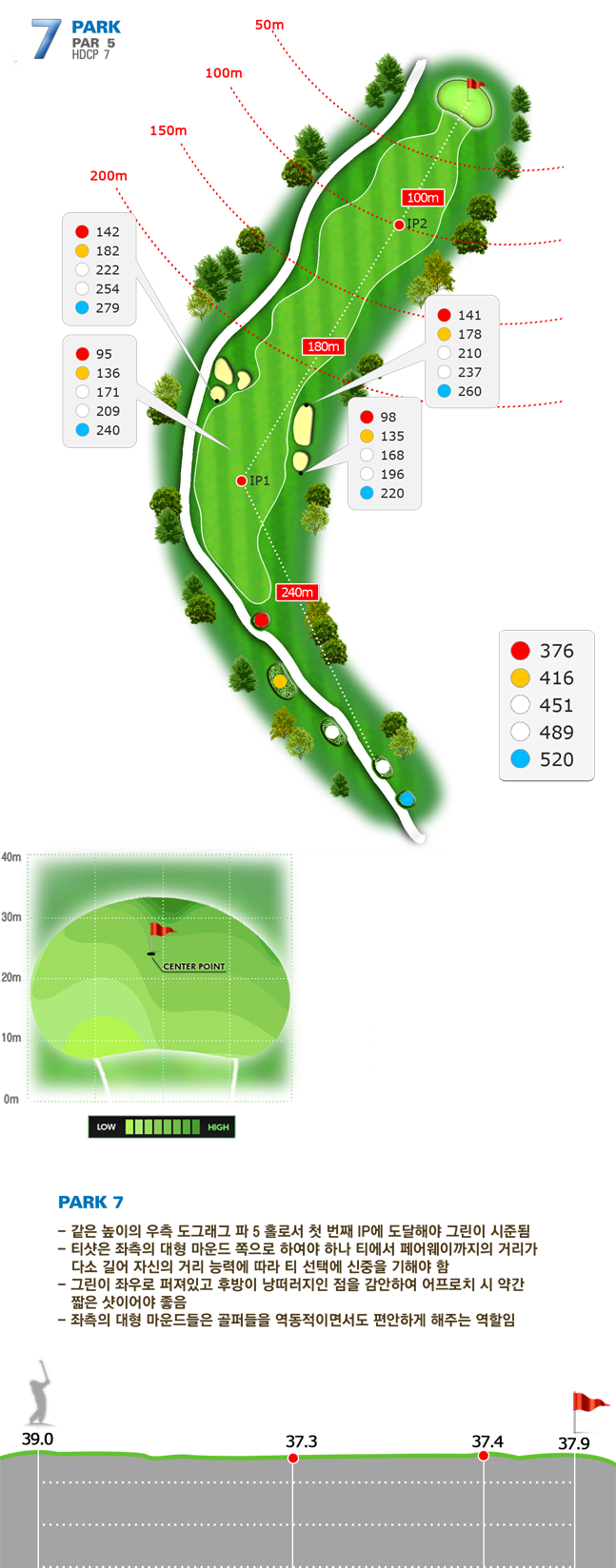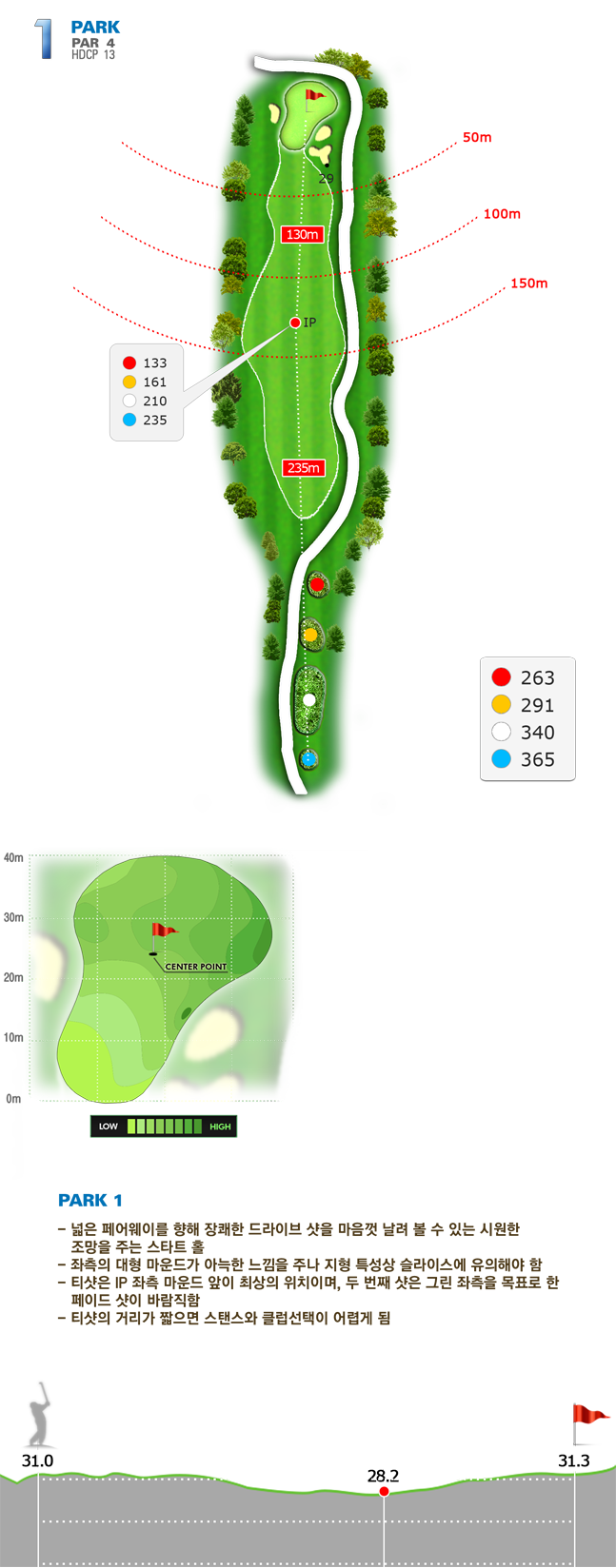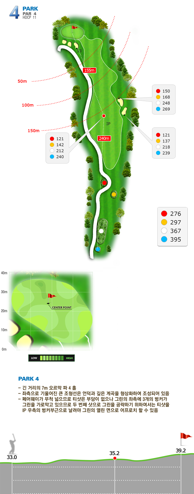 | 파크 OUT 코스 02번 파4홀. 전장 약 380m로 길다. 티샷은 왼쪽 러프. 180m 유틸리티 21도로 그린 우측 안착. 투 펏으로 파!! | |