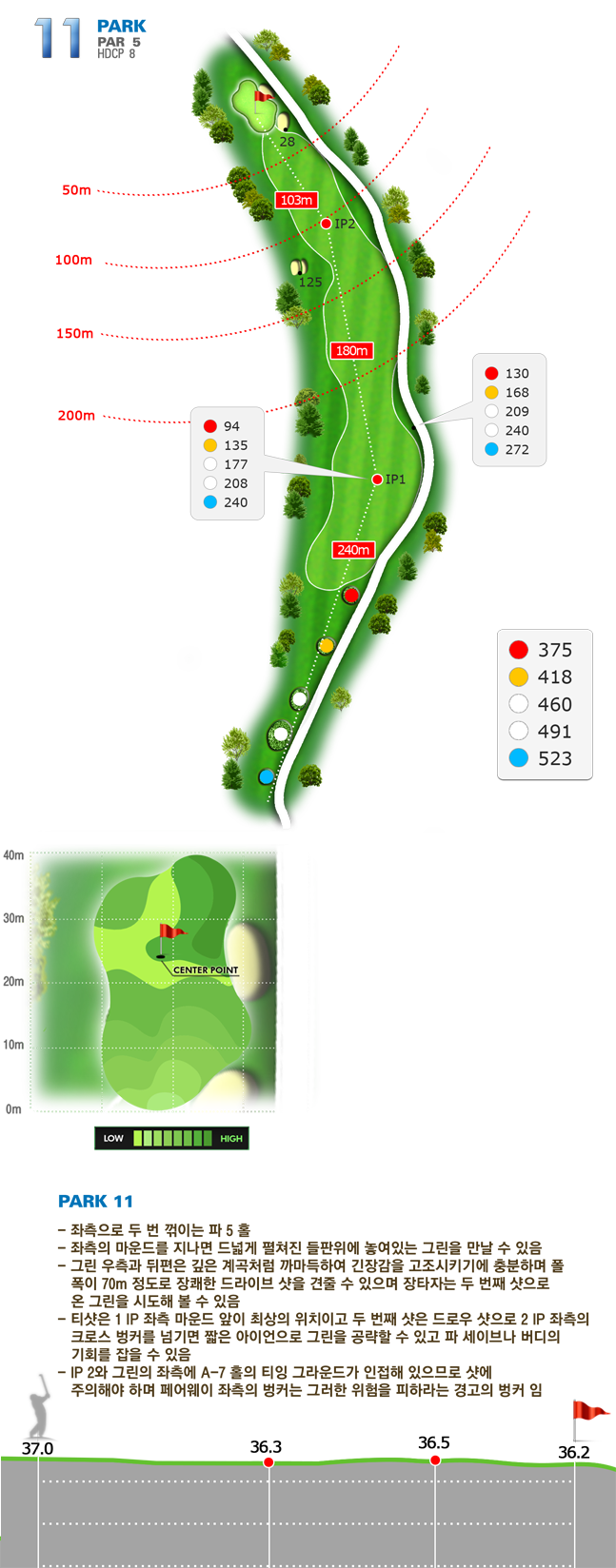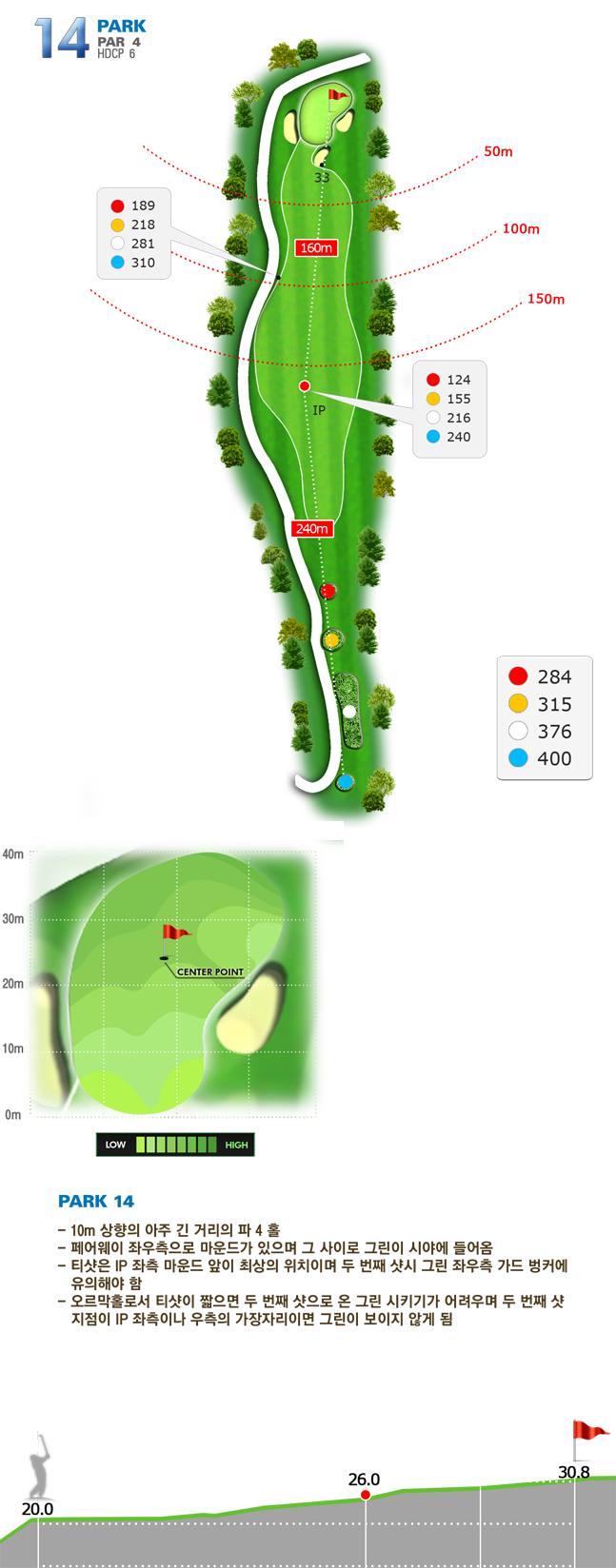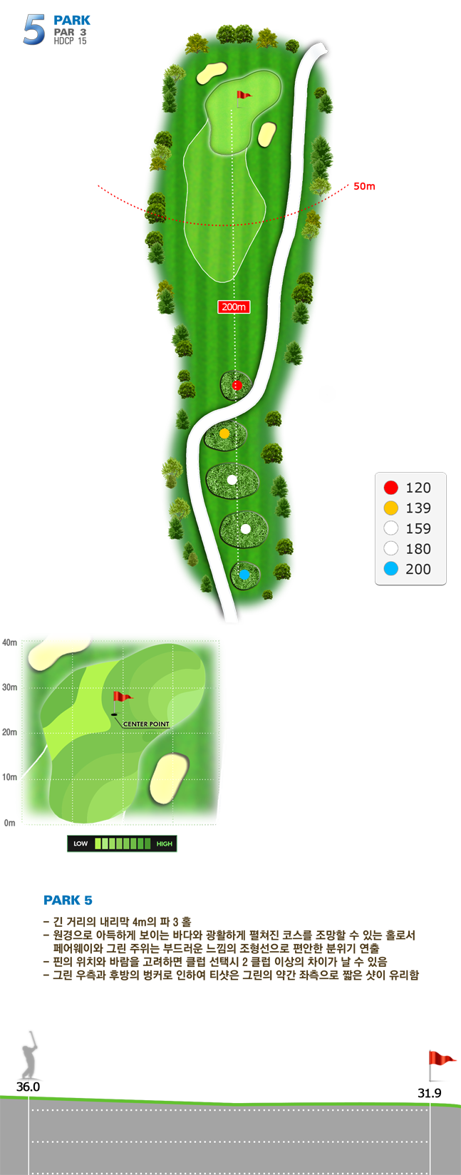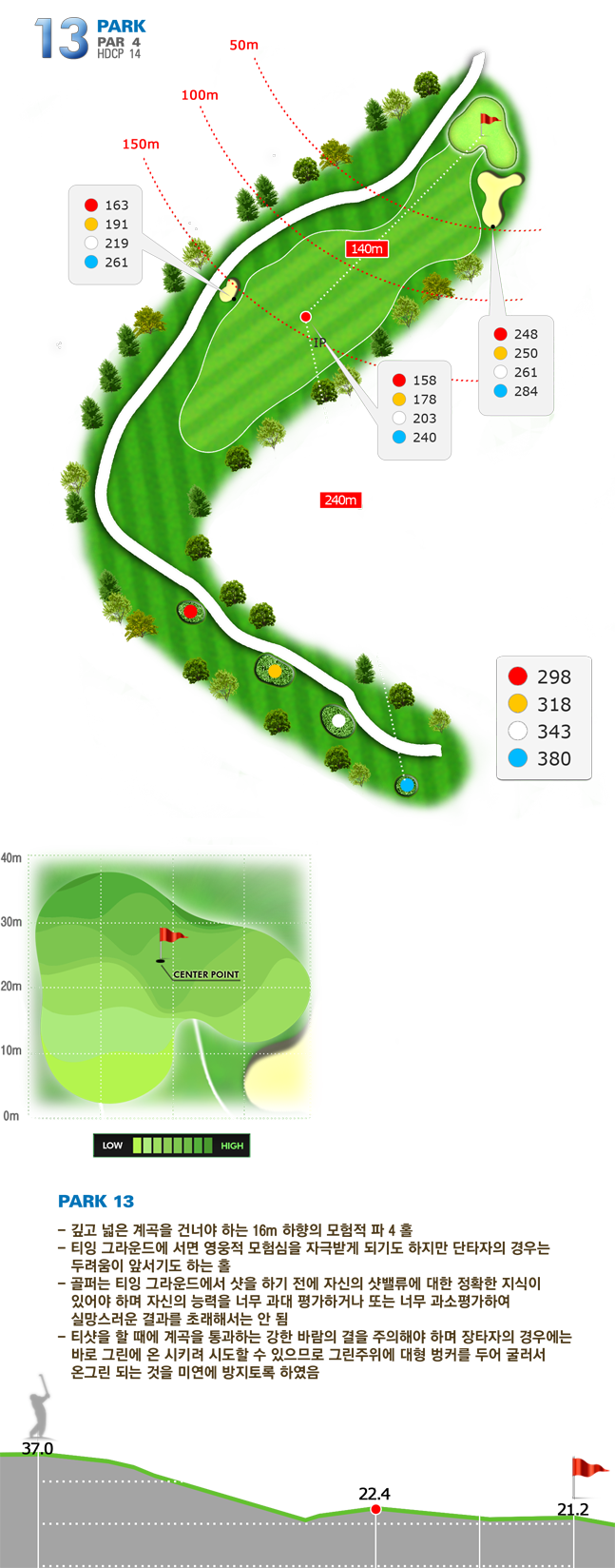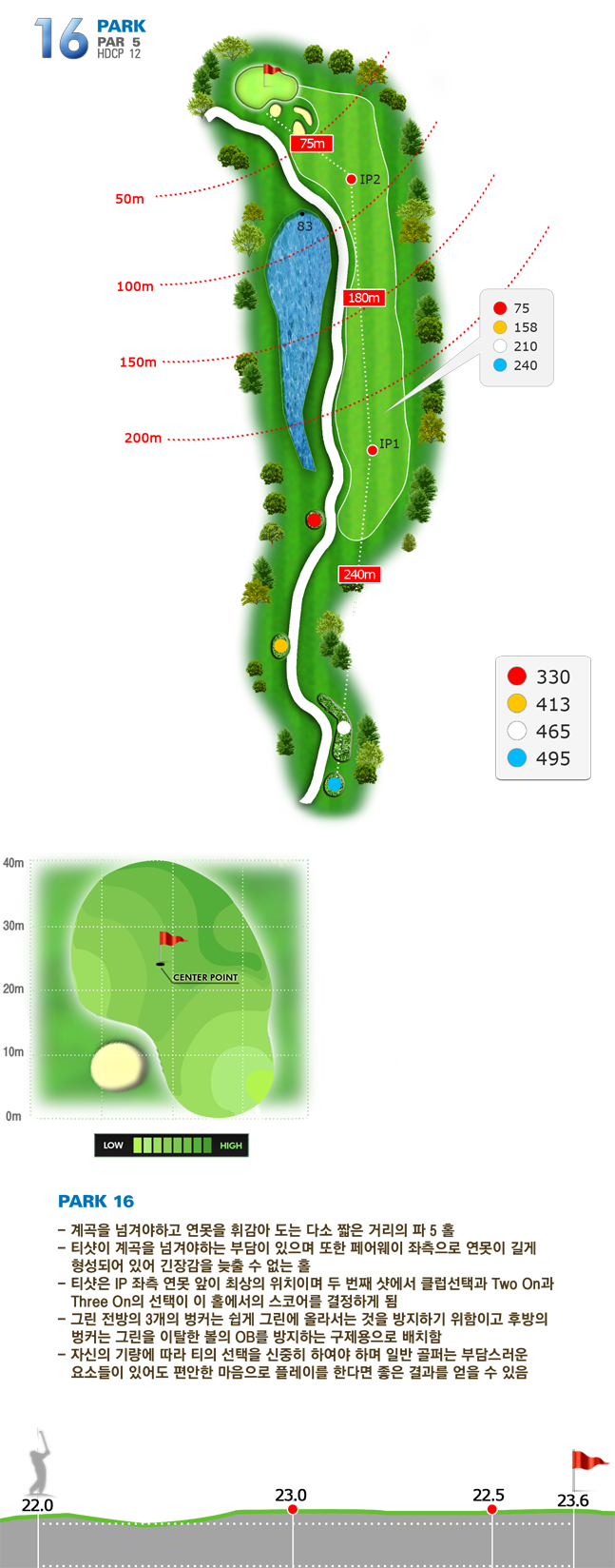 | 파크 OUT 코스 02번 파4홀. 전장 약 380m로 길다. 티샷은 왼쪽 러프. 180m 유틸리티 21도로 그린 우측 안착. 투 펏으로 파!! | |