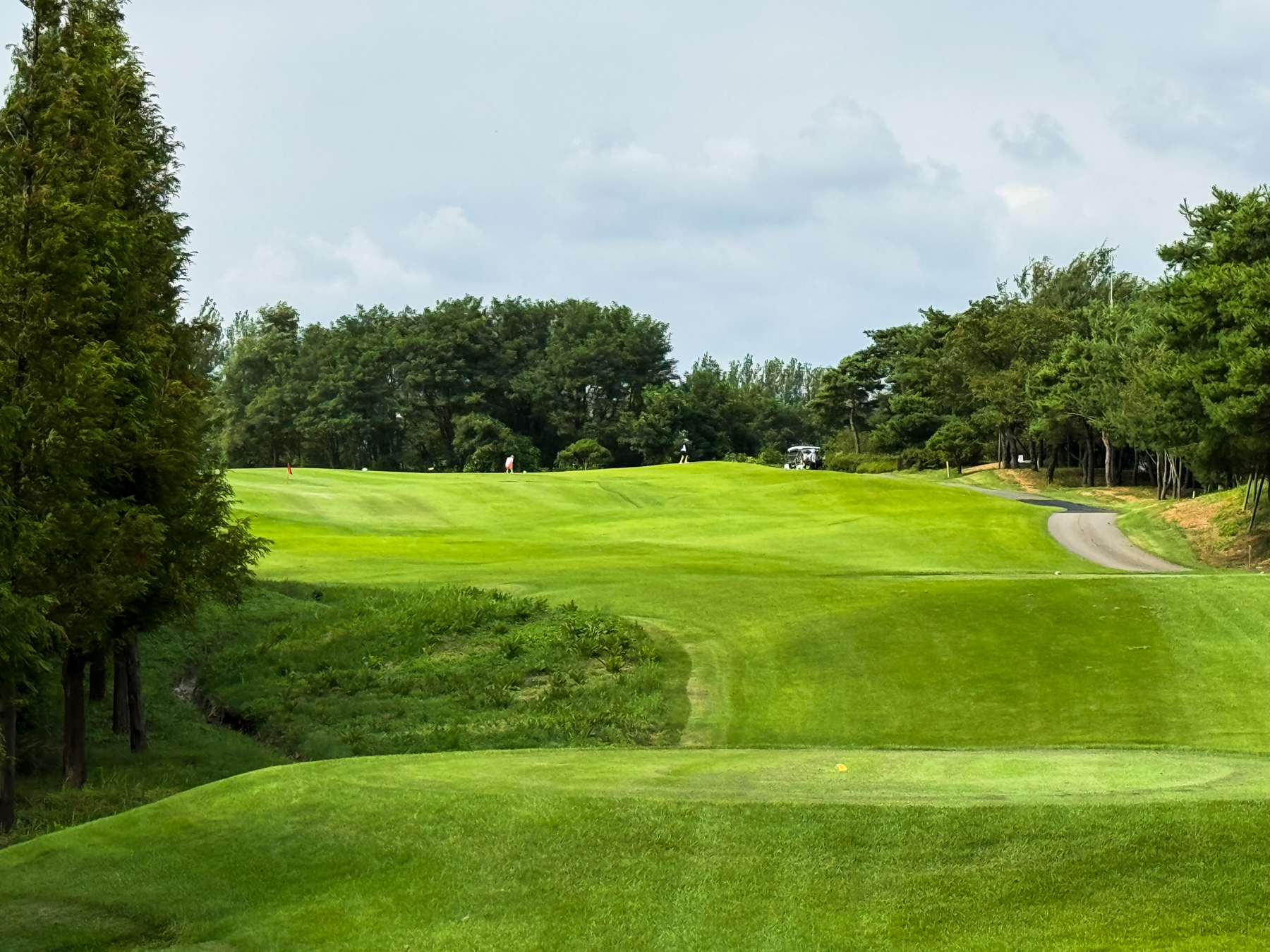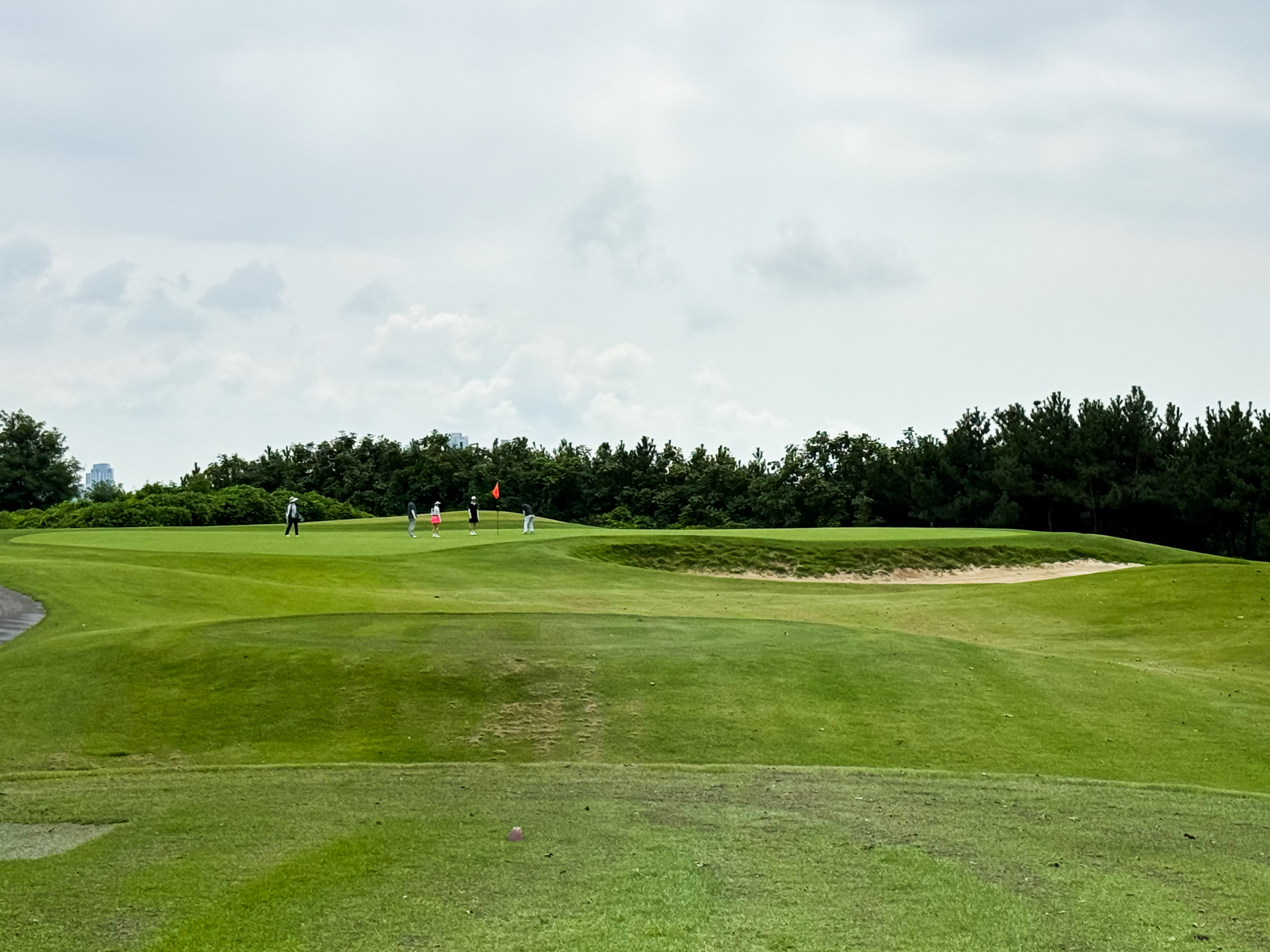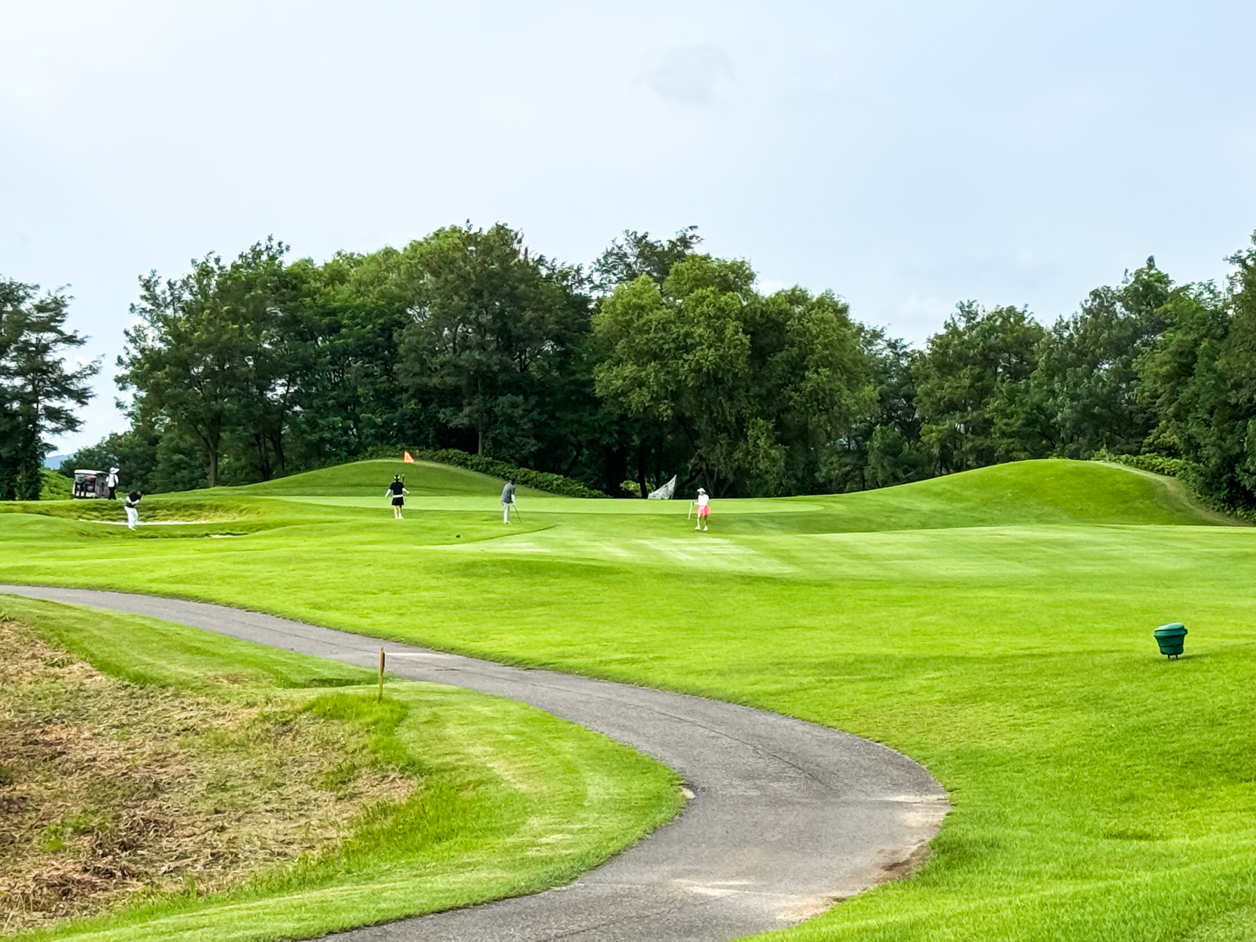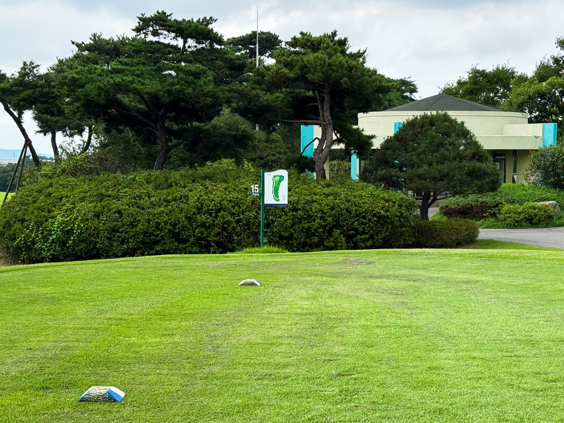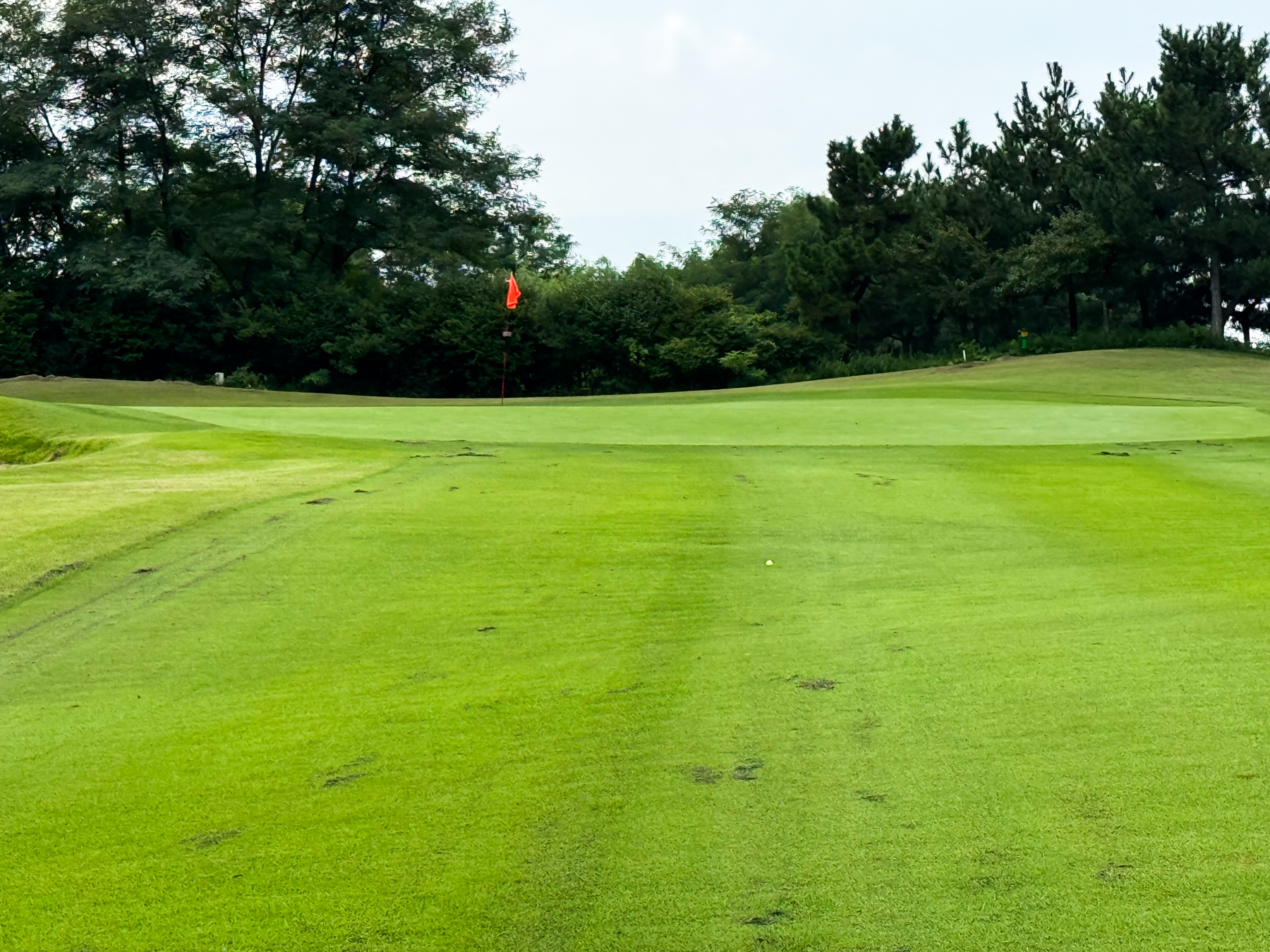 | 파크 OUT 코스 09번 파4홀. 사진 상으로는 정면에 보이는 깃발이 그린 핀 같아 보이지만 실제 그린은 좌측 벙커 뒤에 있음. 티샷은 페어웨이 우측으로 잘 떨어졌지만 그린과 멀어져 세컨이 길게 남음. 약180m 세컨을 18도 유틸로 쳤지만 그린 좌측 둔덕 러프에 안착. 그린은 좌에서 우로 엄청난 경사가 있는데 하필 좌측 제일 높은 곳으로 가서 결국 3펏 보기 기록함. ㅠㅠ | |