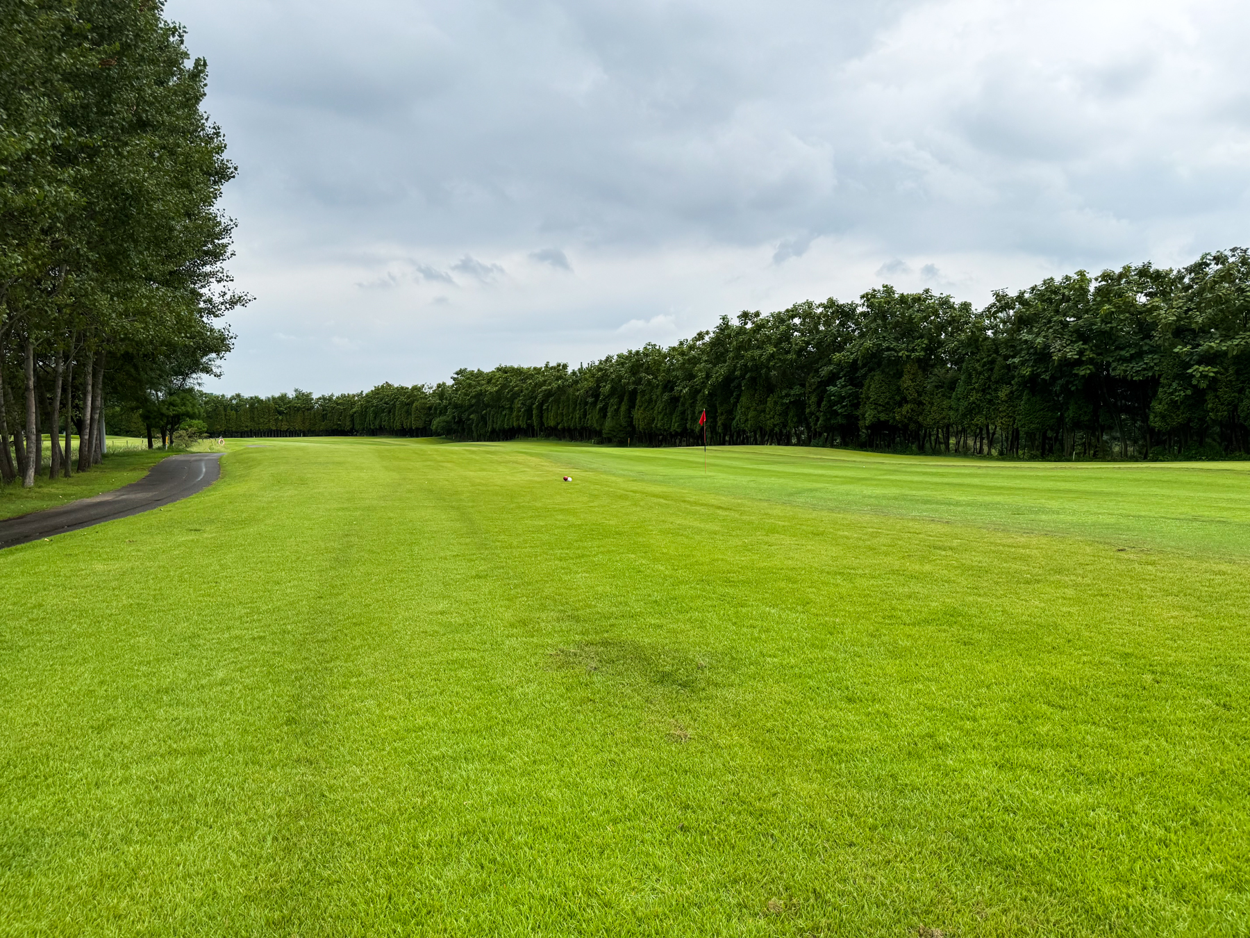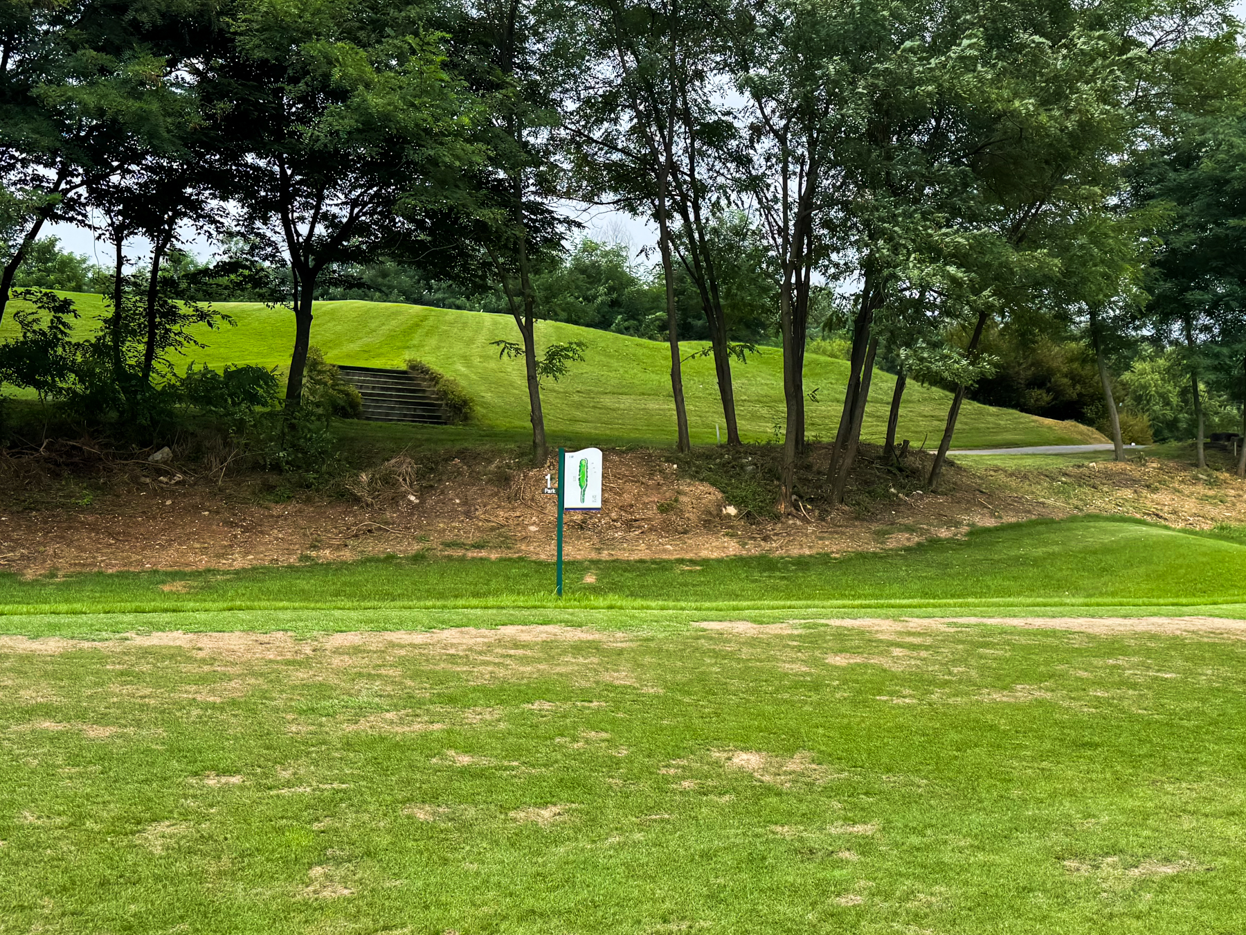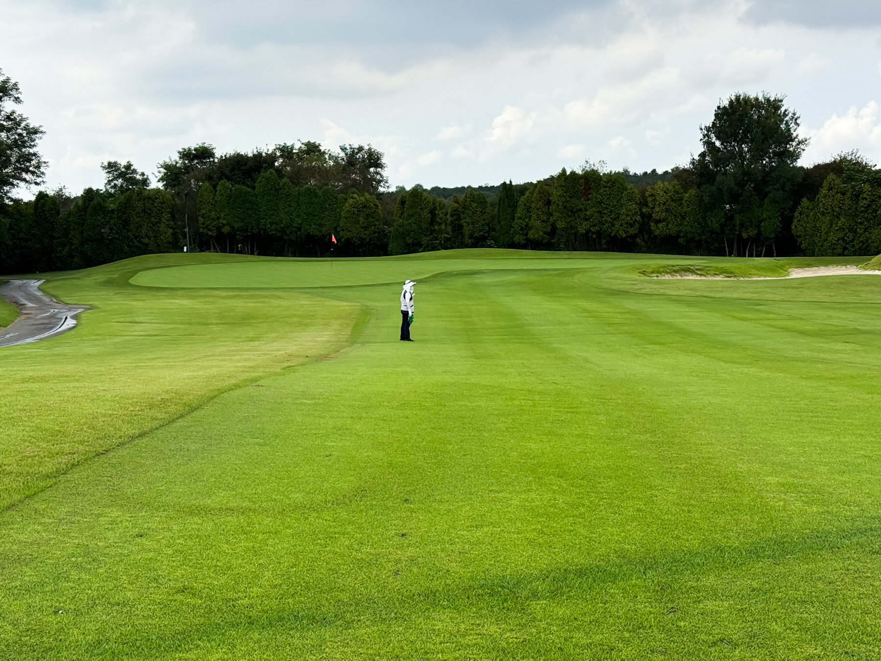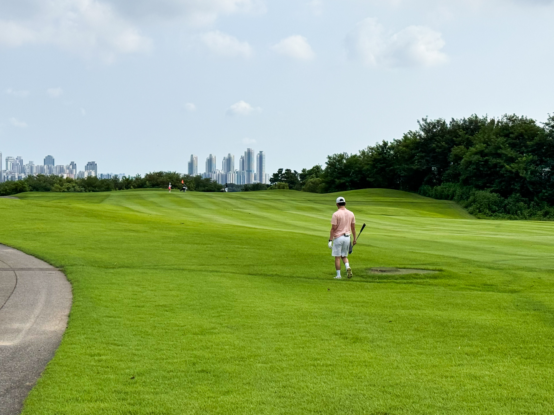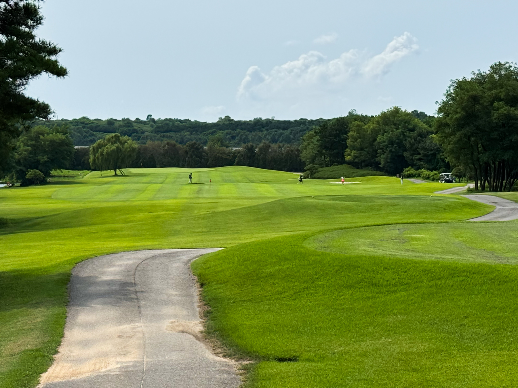| 파크 OUT 코스 09번 파4홀. 사진 상으로는 정면에 보이는 깃발이 그린 핀 같아 보이지만 실제 그린은 좌측 벙커 뒤에 있음. 티샷은 페어웨이 우측으로 잘 떨어졌지만 그린과 멀어져 세컨이 길게 남음. 약180m 세컨을 18도 유틸로 쳤지만 그린 좌측 둔덕 러프에 안착. 그린은 좌에서 우로 엄청난 경사가 있는데 하필 좌측 제일 높은 곳으로 가서 결국 3펏 보기 기록함. ㅠㅠ | |