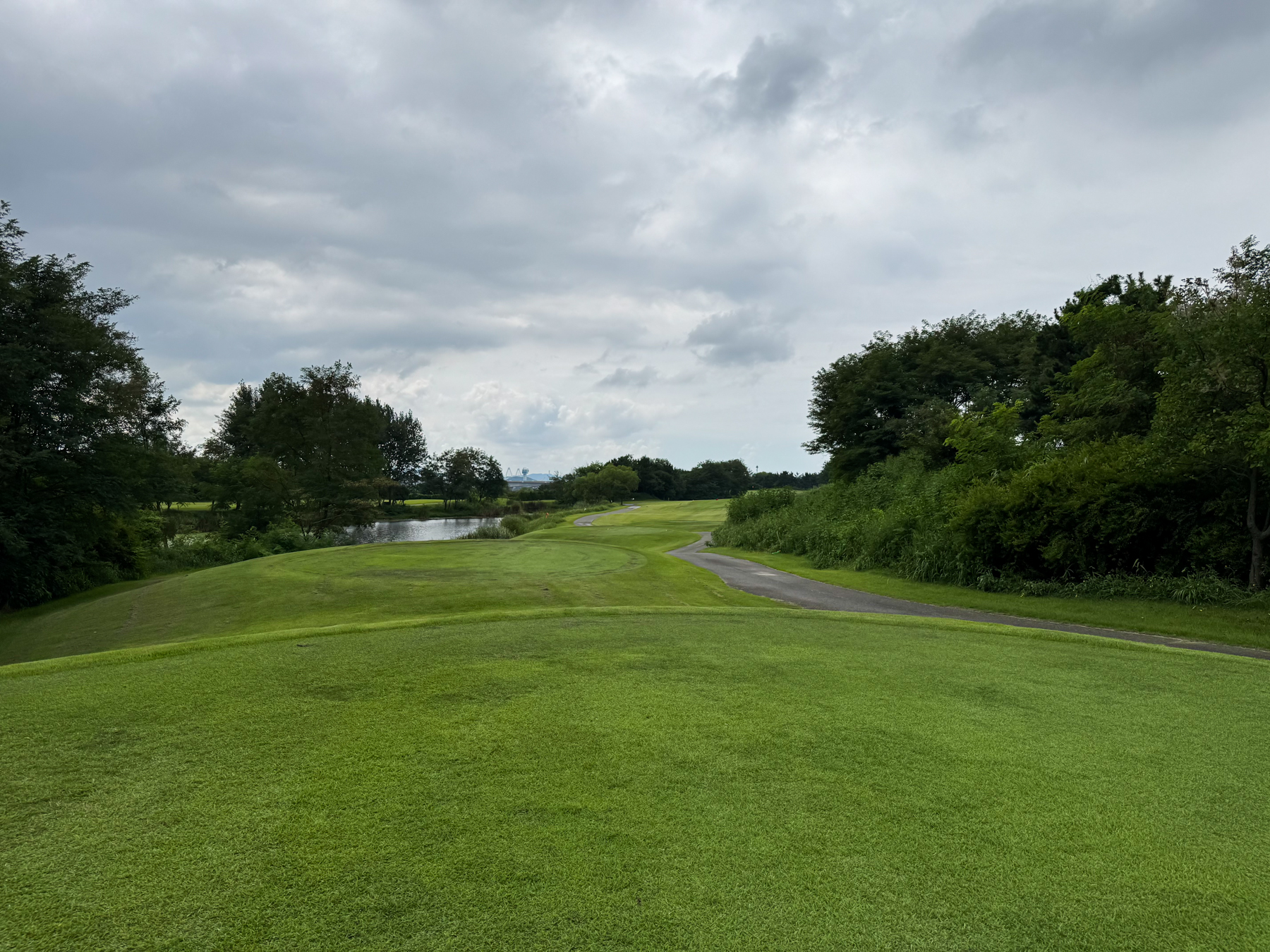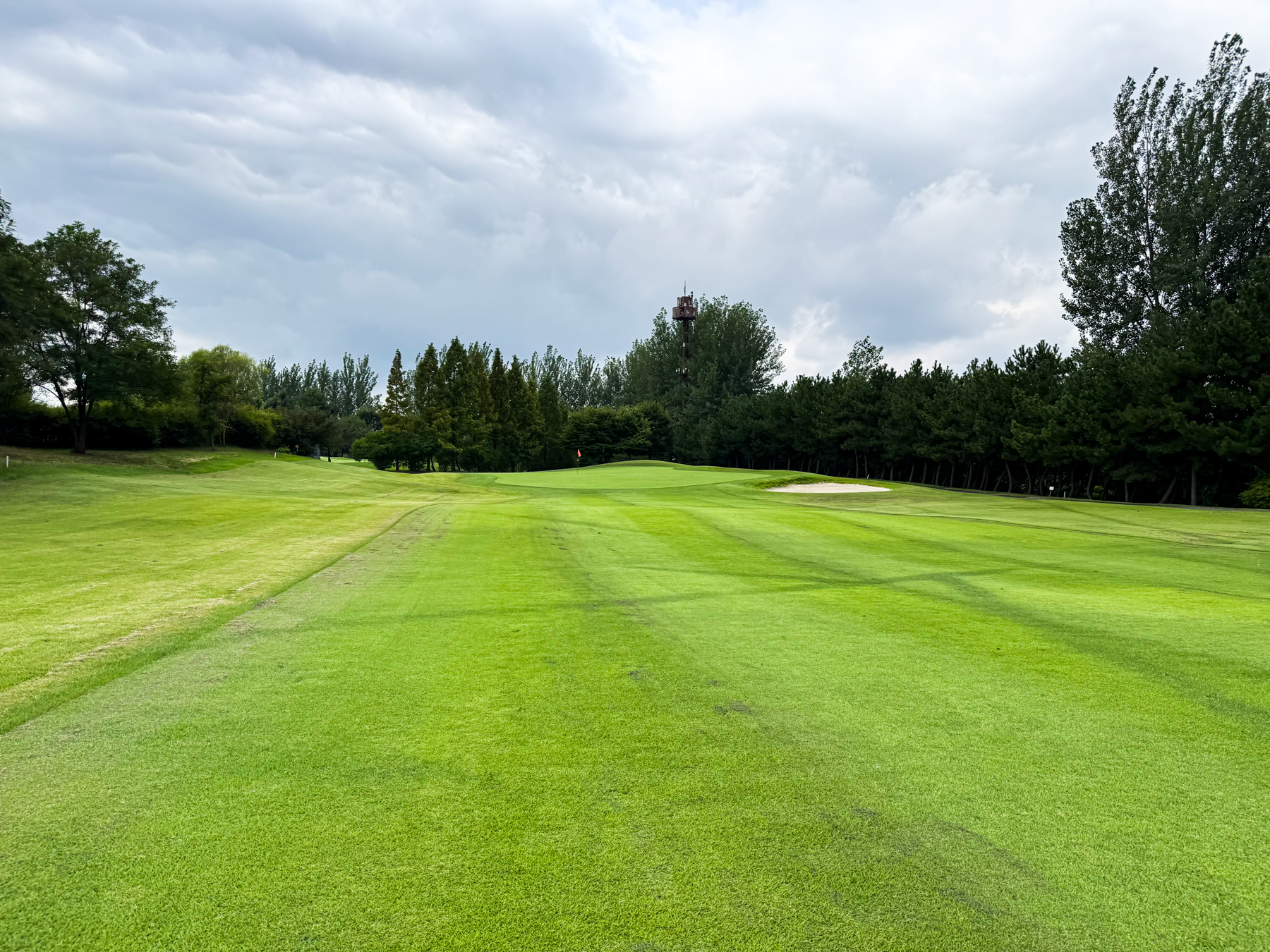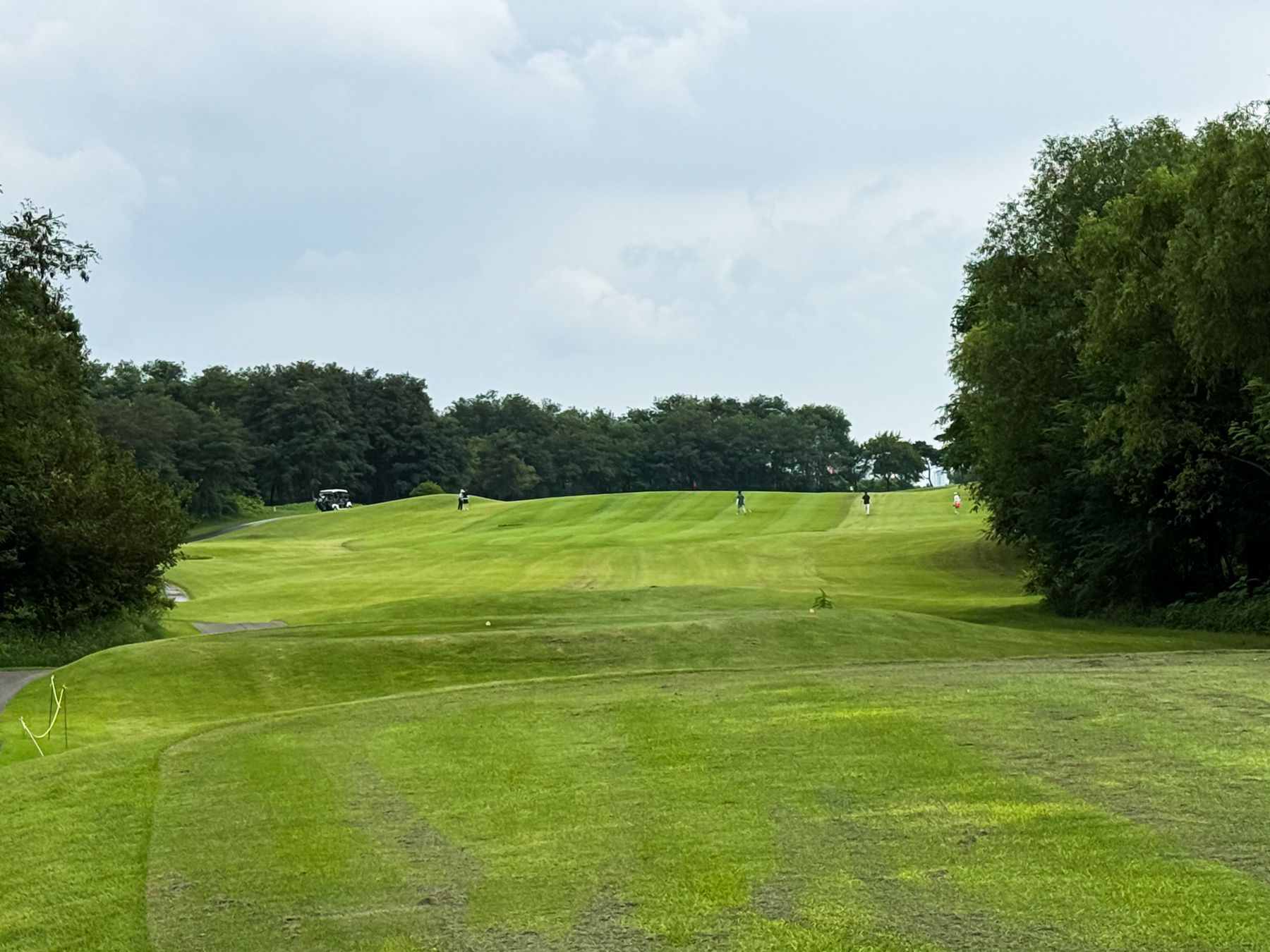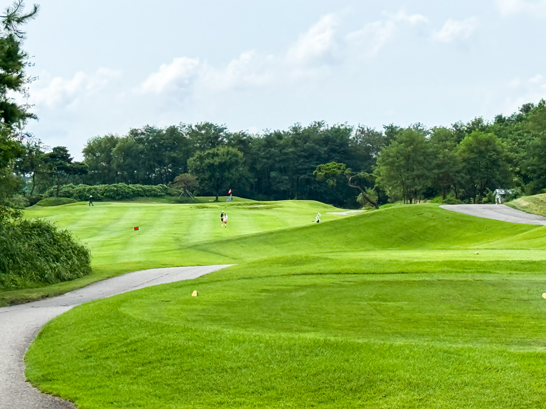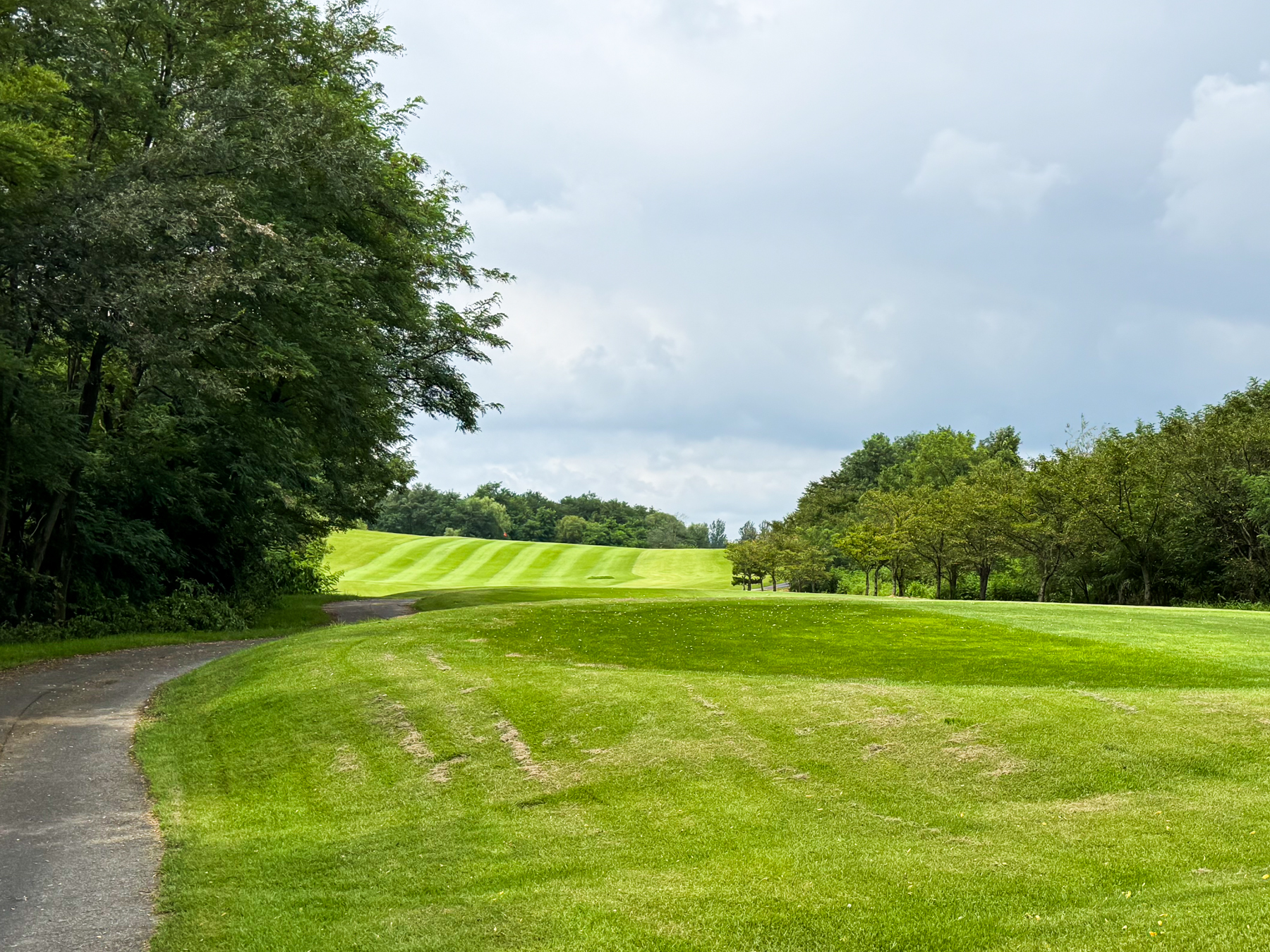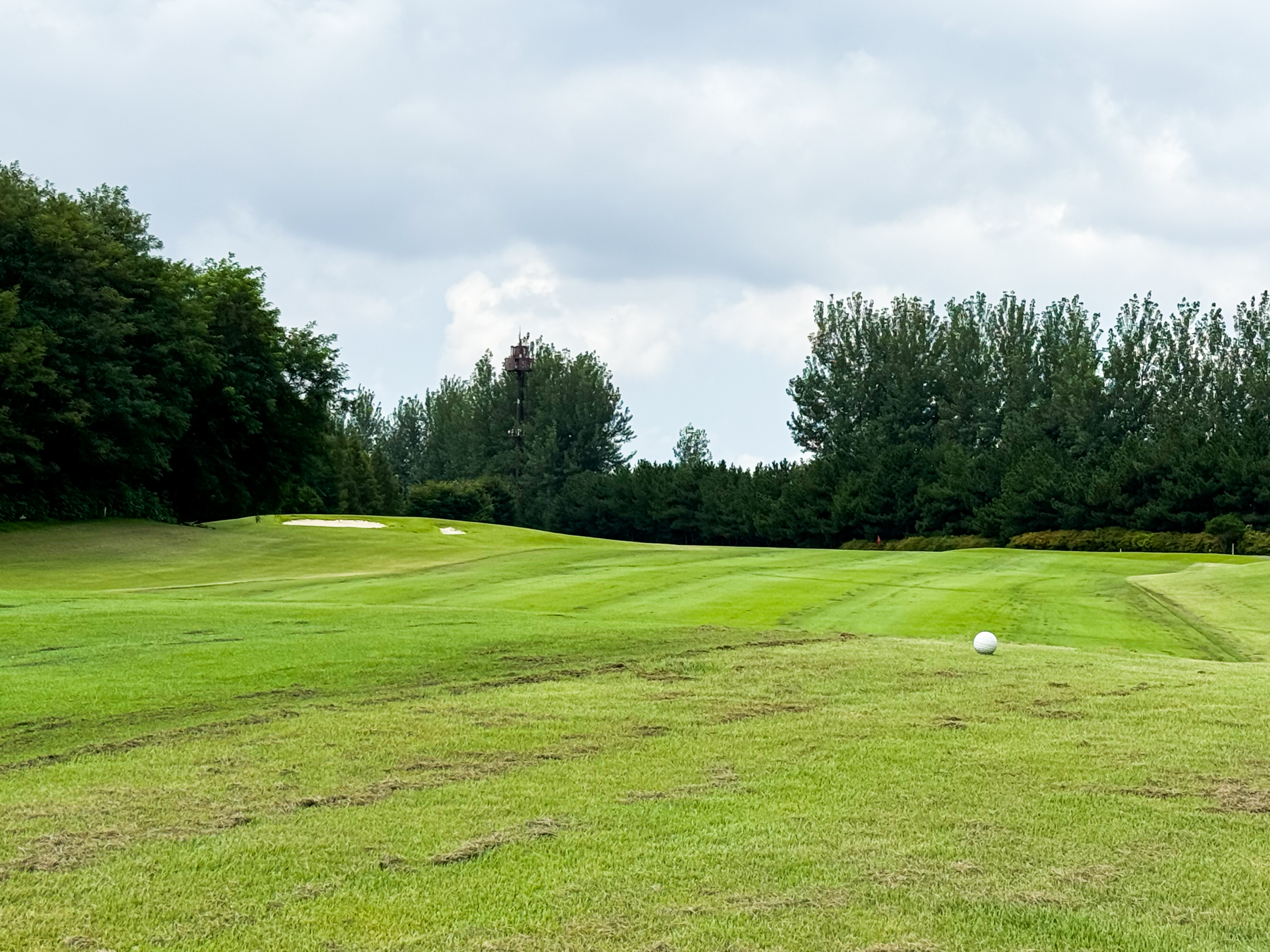 | 파크 OUT 코스 09번 파4홀. 사진 상으로는 정면에 보이는 깃발이 그린 핀 같아 보이지만 실제 그린은 좌측 벙커 뒤에 있음. 티샷은 페어웨이 우측으로 잘 떨어졌지만 그린과 멀어져 세컨이 길게 남음. 약180m 세컨을 18도 유틸로 쳤지만 그린 좌측 둔덕 러프에 안착. 그린은 좌에서 우로 엄청난 경사가 있는데 하필 좌측 제일 높은 곳으로 가서 결국 3펏 보기 기록함. ㅠㅠ | |