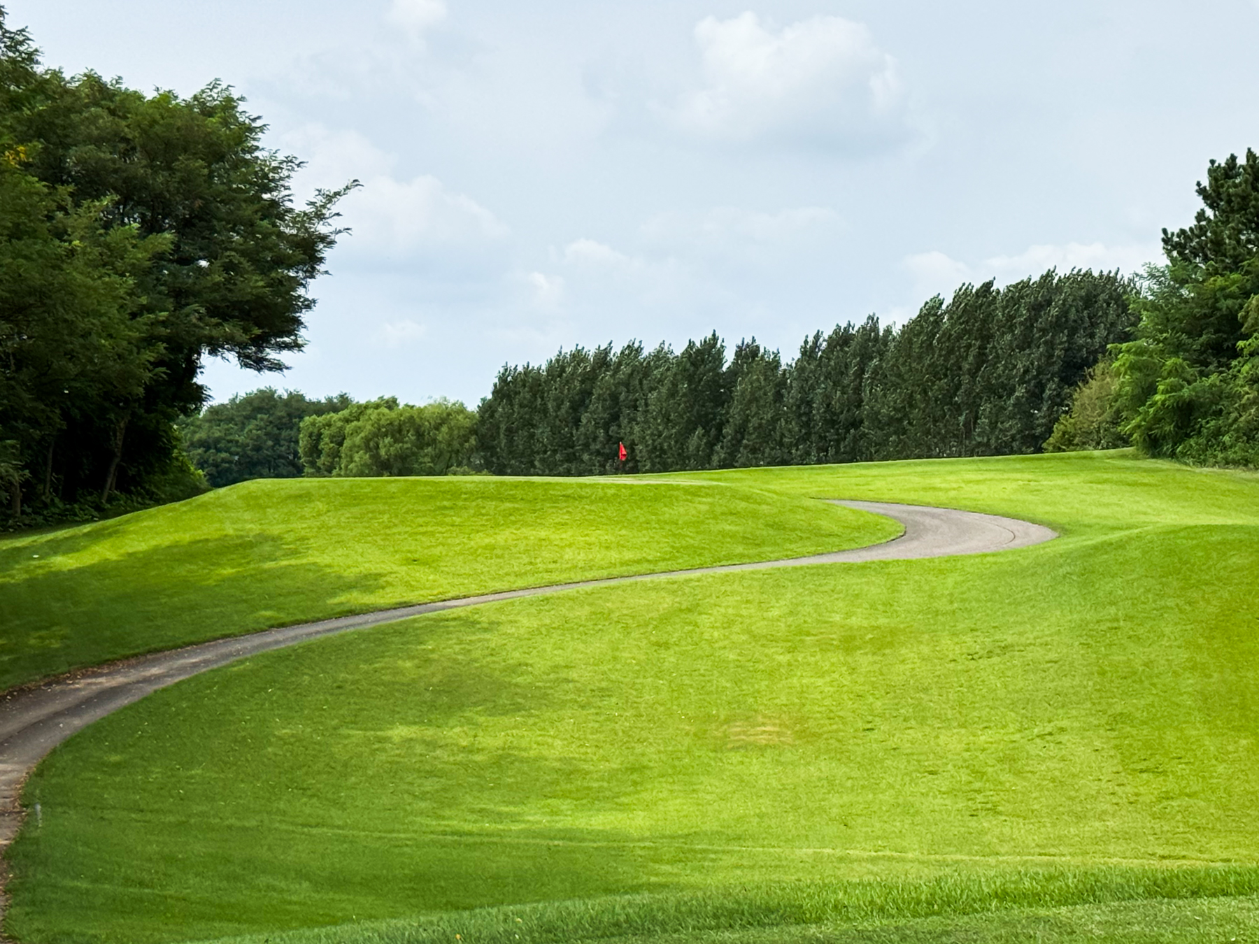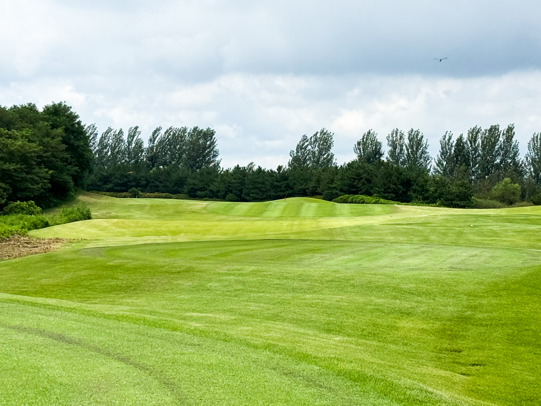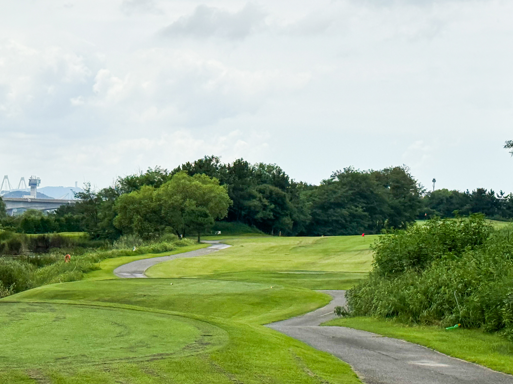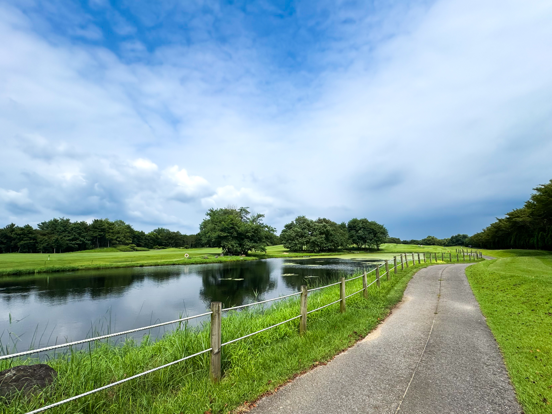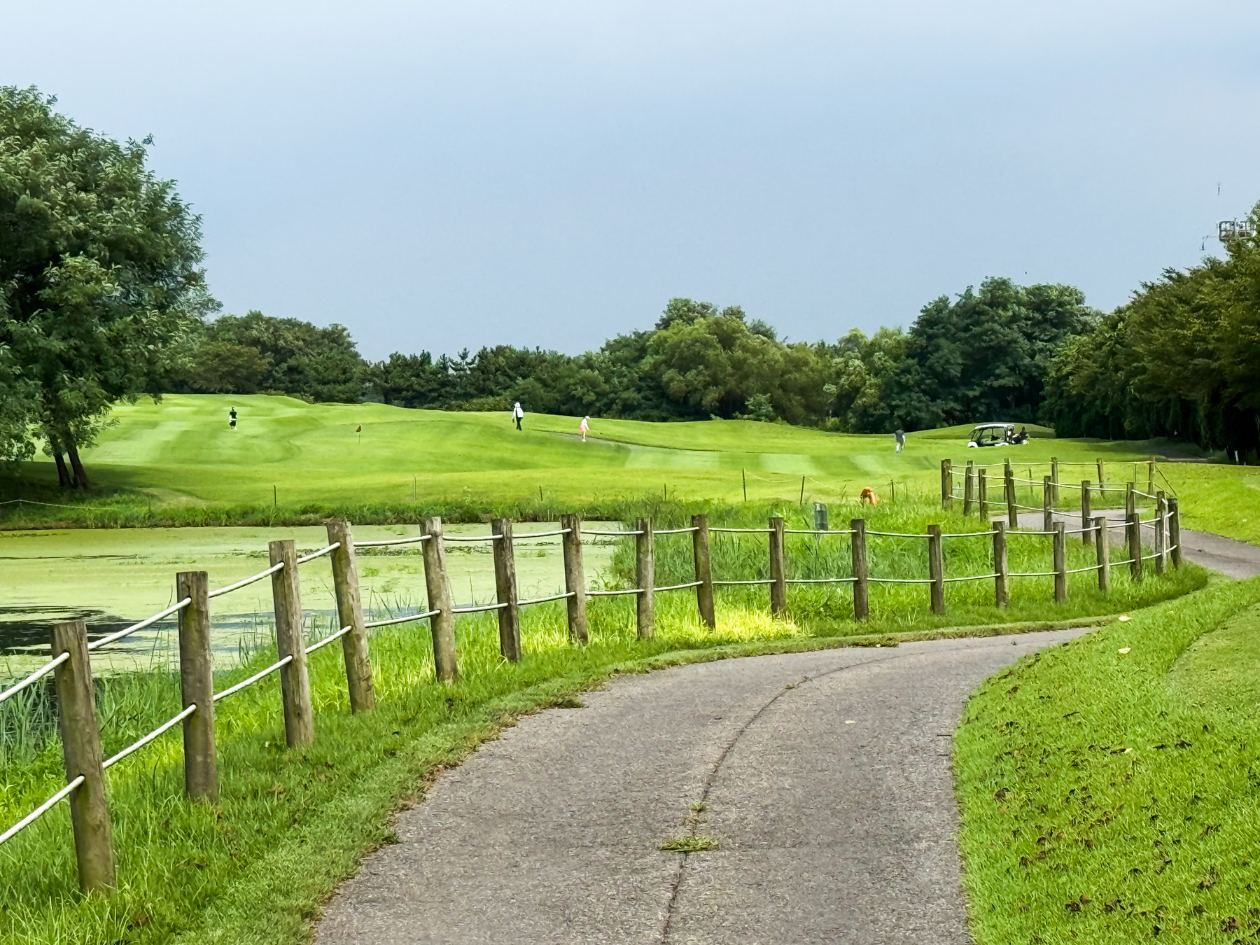 | 파크 OUT 코스 09번 파4홀. 사진 상으로는 정면에 보이는 깃발이 그린 핀 같아 보이지만 실제 그린은 좌측 벙커 뒤에 있음. 티샷은 페어웨이 우측으로 잘 떨어졌지만 그린과 멀어져 세컨이 길게 남음. 약180m 세컨을 18도 유틸로 쳤지만 그린 좌측 둔덕 러프에 안착. 그린은 좌에서 우로 엄청난 경사가 있는데 하필 좌측 제일 높은 곳으로 가서 결국 3펏 보기 기록함. ㅠㅠ | |