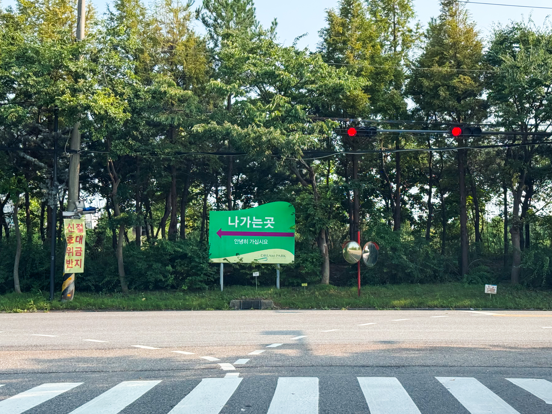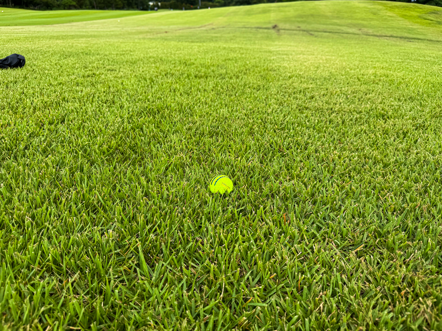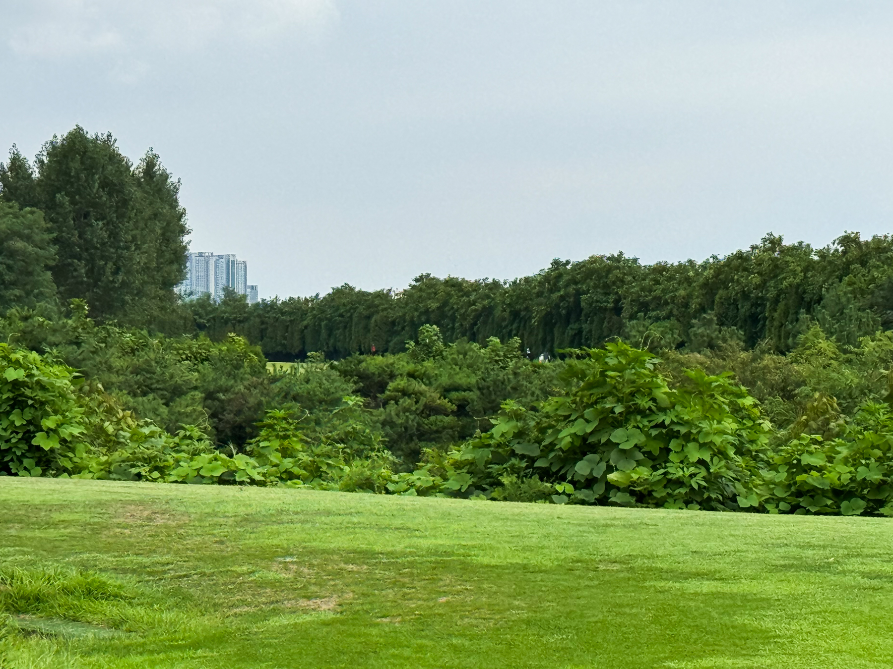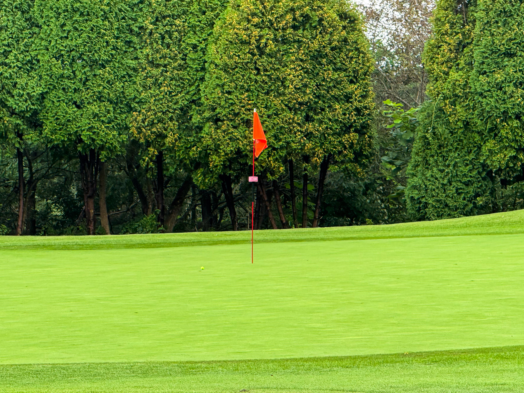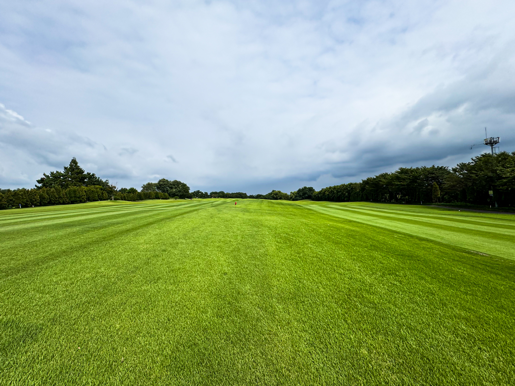 | 파크 OUT 코스 09번 파4홀. 사진 상으로는 정면에 보이는 깃발이 그린 핀 같아 보이지만 실제 그린은 좌측 벙커 뒤에 있음. 티샷은 페어웨이 우측으로 잘 떨어졌지만 그린과 멀어져 세컨이 길게 남음. 약180m 세컨을 18도 유틸로 쳤지만 그린 좌측 둔덕 러프에 안착. 그린은 좌에서 우로 엄청난 경사가 있는데 하필 좌측 제일 높은 곳으로 가서 결국 3펏 보기 기록함. ㅠㅠ | |