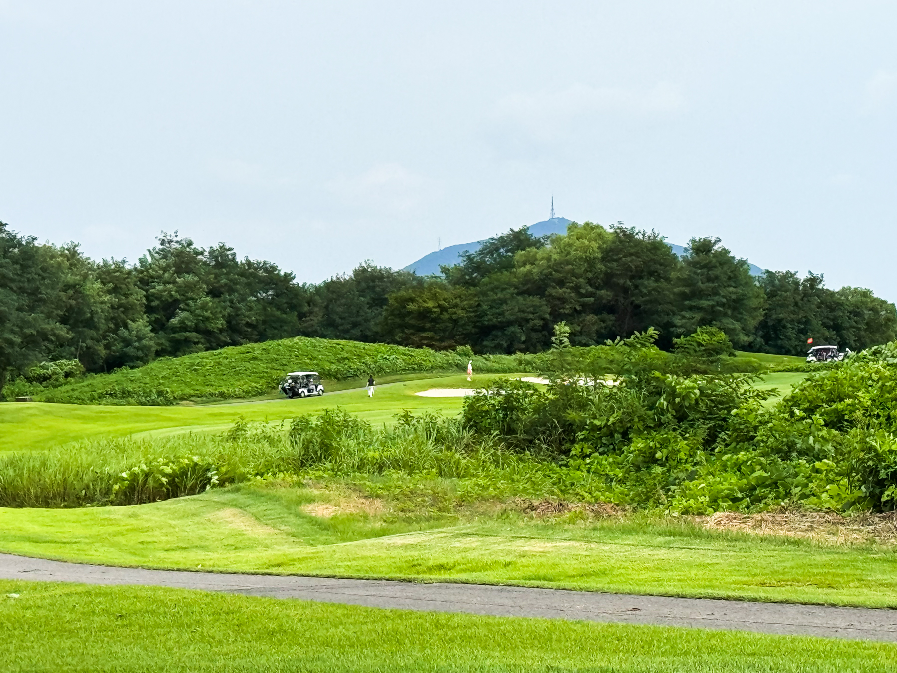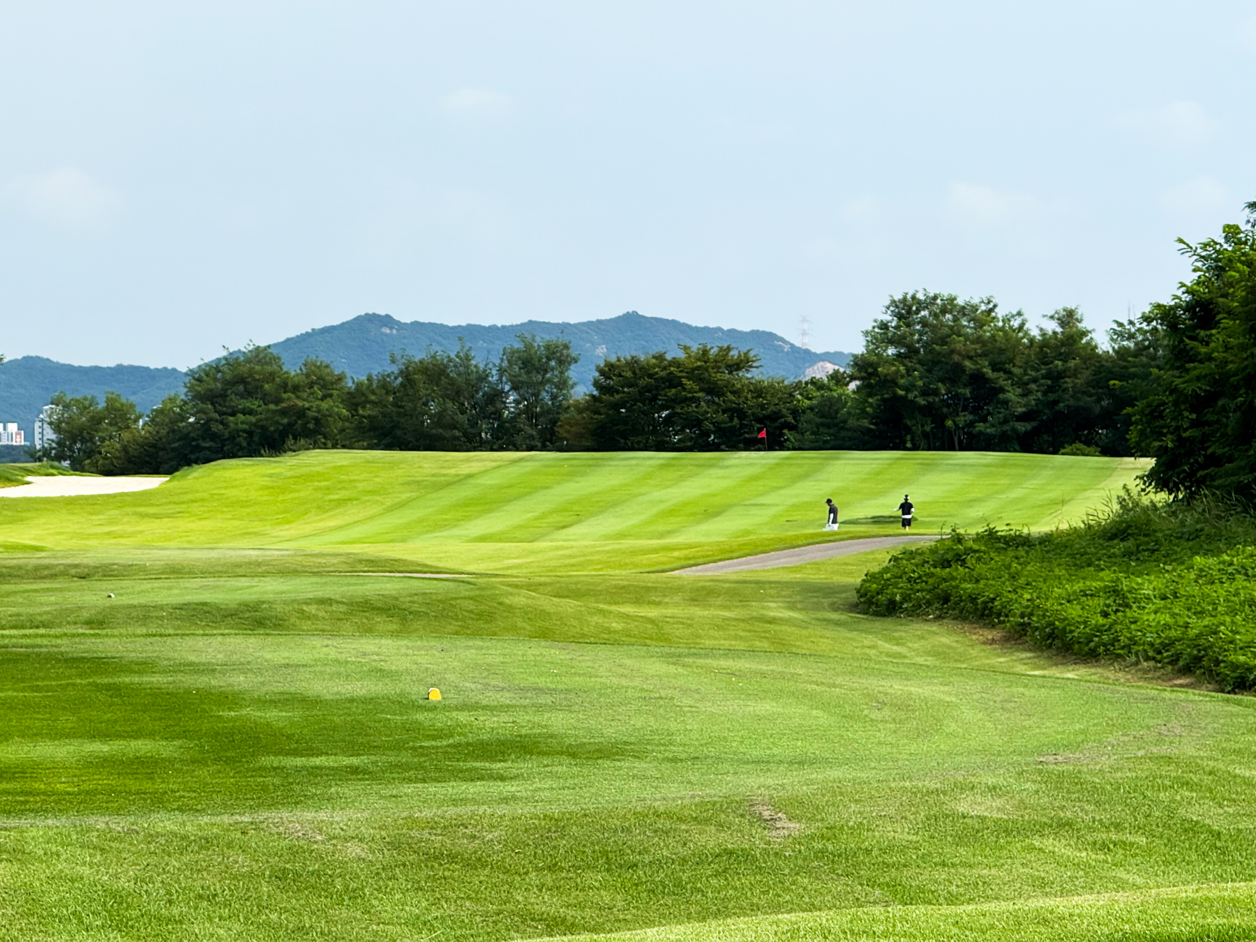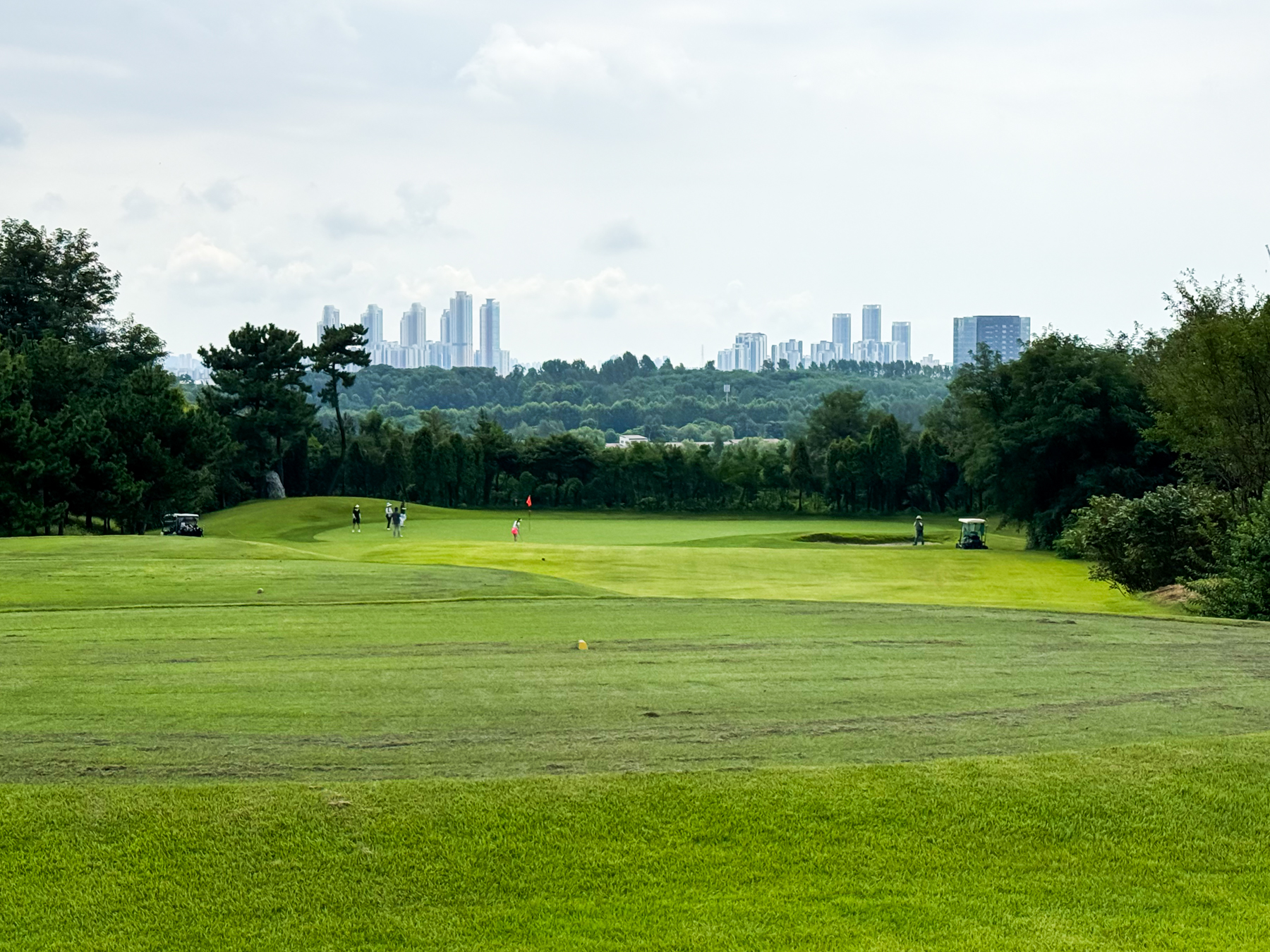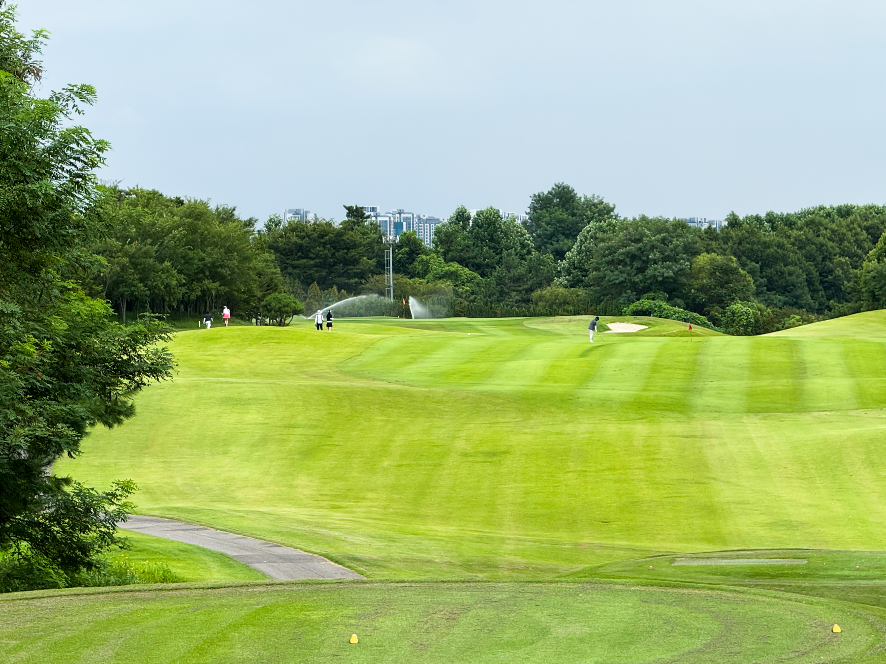 | 파크 OUT 코스 07번 파5홀. 490m이나 우도그렉홀로 티샷 가로질러 가면 200m 안쪽으로도 남을 수 있는 홀이다. 나는 안전빵으로 멀리 보이는 계양산 탑과 카트 사이로 공략을 했고 세컨 3우드로 그린 앞 70m까지 갔으나 써드 40m...ㅠㅠ 결국 4온 투펏으로 보기~! 2번홀부터 6번까지 연속 파 행진에 들떠있었던 듯... | |