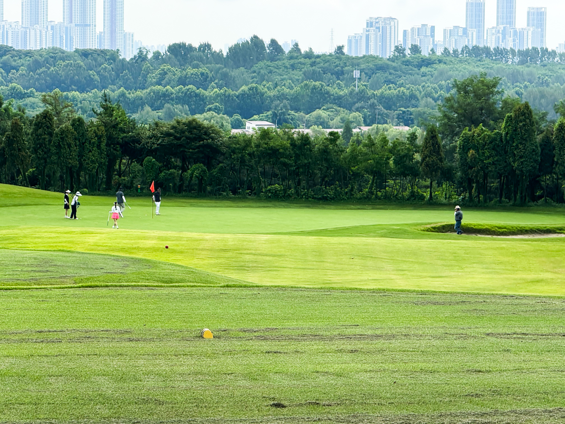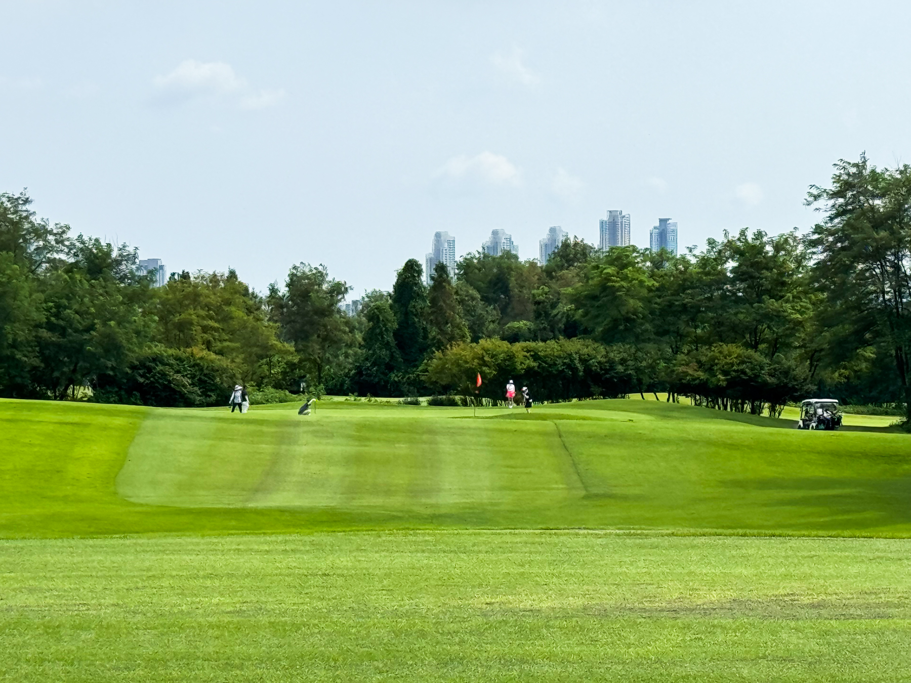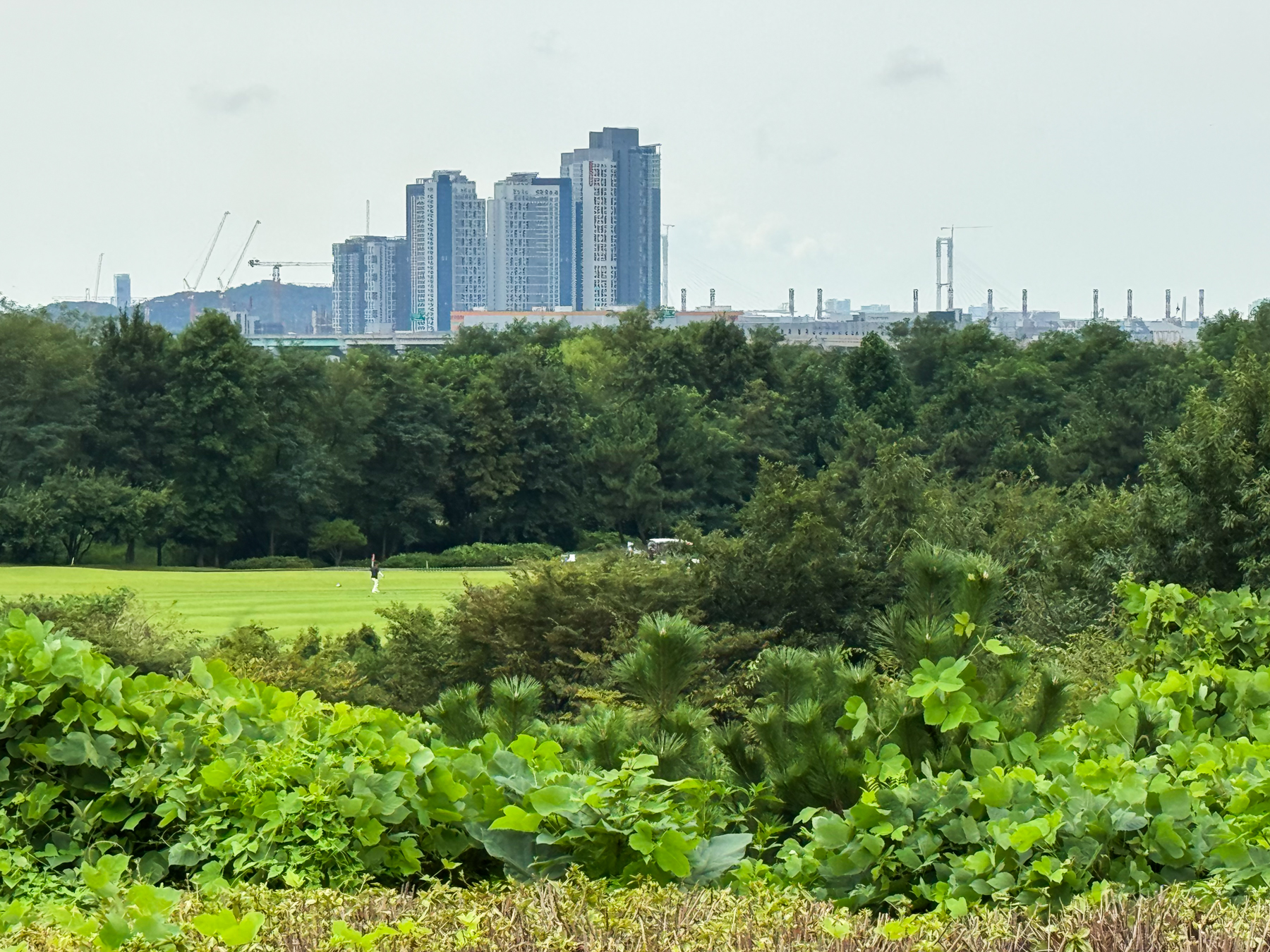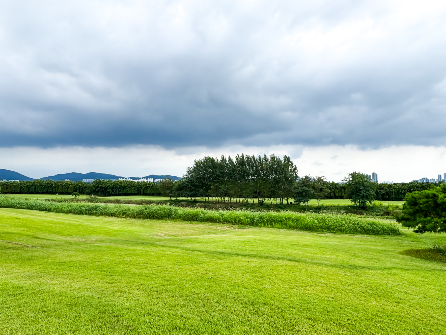 | 파크 OUT 코스 07번 파5홀. 490m이나 우도그렉홀로 티샷 가로질러 가면 200m 안쪽으로도 남을 수 있는 홀이다. 나는 안전빵으로 멀리 보이는 계양산 탑과 카트 사이로 공략을 했고 세컨 3우드로 그린 앞 70m까지 갔으나 써드 40m...ㅠㅠ 결국 4온 투펏으로 보기~! 2번홀부터 6번까지 연속 파 행진에 들떠있었던 듯... | |