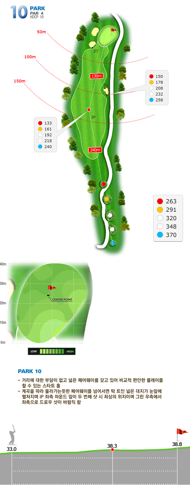 | 파크 IN 코스 10번홀 파4. IP 지점 부근에 능선 같은게 형성되어 있다. 티샷이 짧은 나는 그 능선을 넘기지 못해 그린 깃대를 볼 수 없었다. 세컨 약 150m 남아 5번 아이언 쳤고 살짝 당겨져서 그린 좌측 러프 안착. 대략 20m 어프로치 컨시드 붙여 파~!! | |