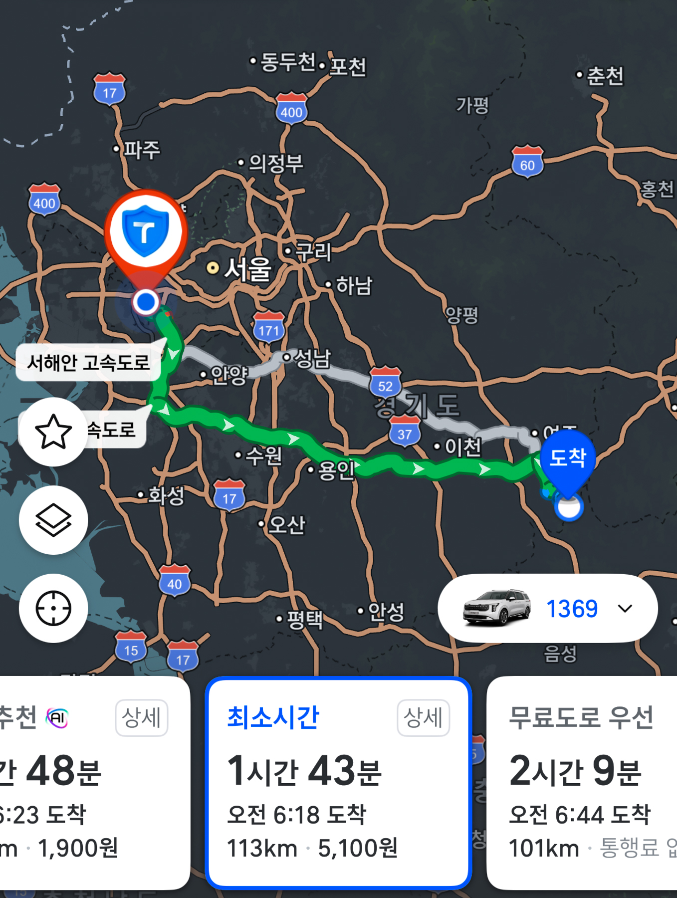 | 왼쪽은 일주일 전 토요일 새벽 5시에 찍어본 내비 사진으로 1시간 50분 소요로 나왔고, 우측은 오늘 당일 새벽 4시 30분경 찍어본 내비 화면인데 캡쳐한 시간대를 감안하면 시간이 비슷하다고 볼 수 있다. | |