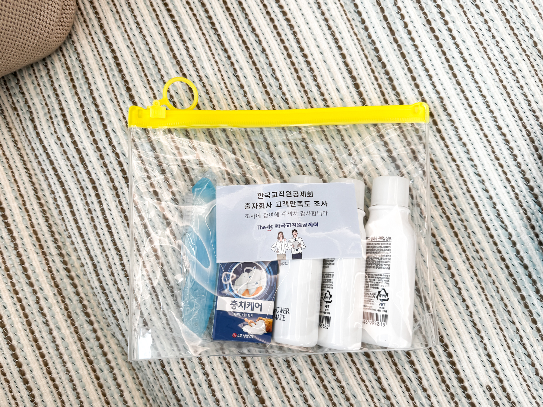 | 라운드 마치고 정산 끝냈는데 사람들이 모여 있다. 뭔가 했는데 설문 조사 중이었고 설문 작성 완료하면 여행용 세면도구 세트를 준다고 한다. 쭈니가 곧 일본 여행 예정이라 설문 하고 증정품 받음. ^^ | |